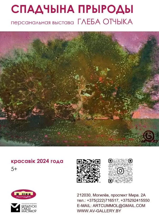 «Спадчына прыроды» – название выставочного проекта, который познакомит с творчеством минского художника и преподавателя Глеба Отчика. Природа – одна из самых любимых тем живописца. Работает он и в различных техниках монументального искусства (камень, графит, фреска). Самые известные его работы: мозаичное панно «Тайны купальской ночи», размещенное на фасаде завода «Керамин», скульптурная композиция из металла и керамических материалов в виде узнаваемой сине-голубой банки сгущенного молока, дополняющая ансамбль административного здания ОАО «Рогачевский молочноконсервный комбинат». Выполненные Глебом Отчиком росписи украшают детский дом в Ждановичах, Дворец Независимости, здания посольства Казахстана в Беларуси и посольства Беларуси в Баку. В деревне Вишнево Воложинского района художник расписал храм в честь святых Космы и Дамиа.