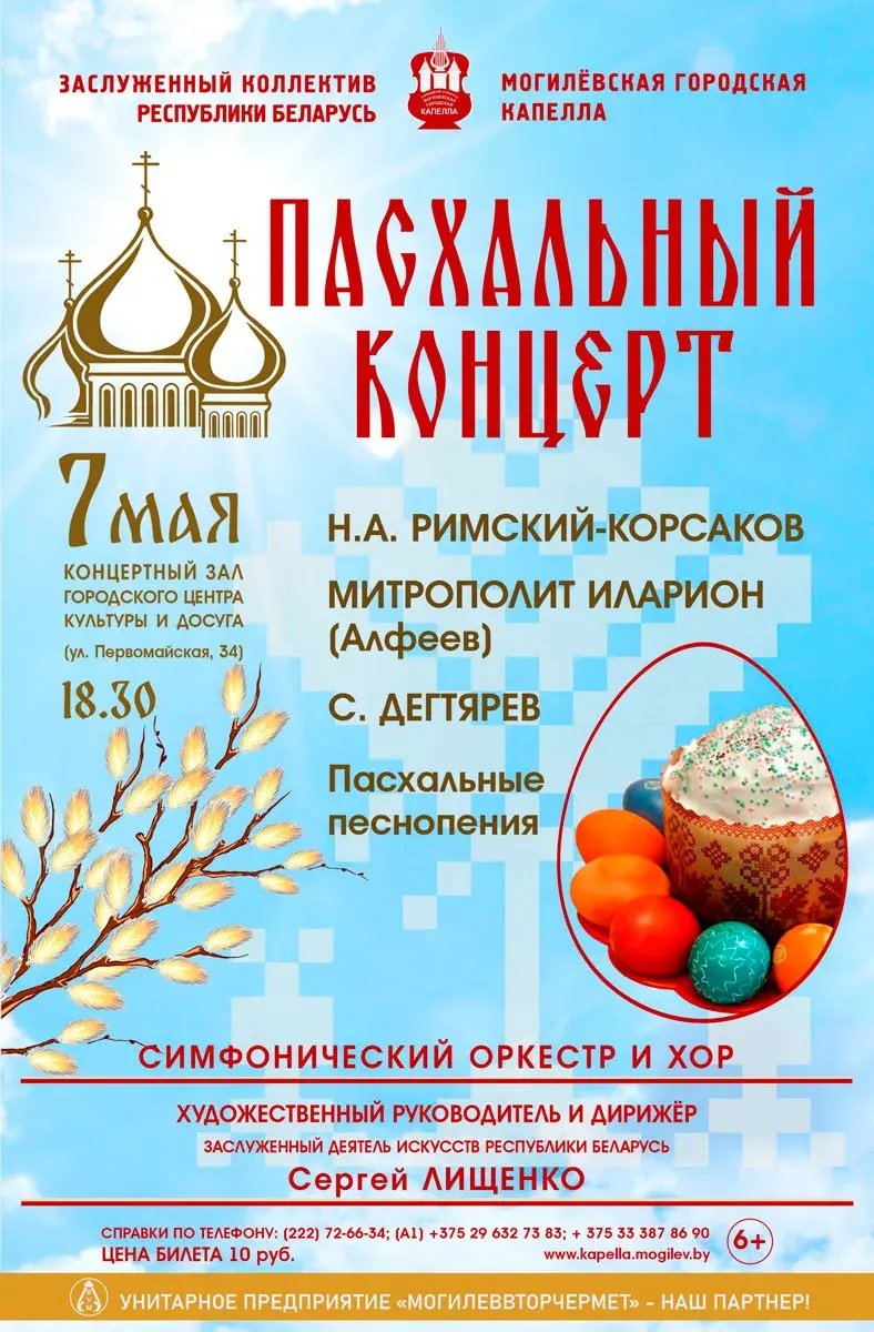 Пасхальный концерт состоится 7 мая в зале Городского центра культуры и досуга Могилева (улица Первомайская, 34). Начало в 18.30. Цена билета – 10 рублей. Справки по телефонам: 80222-72-66-34. +37529-632-73-83.