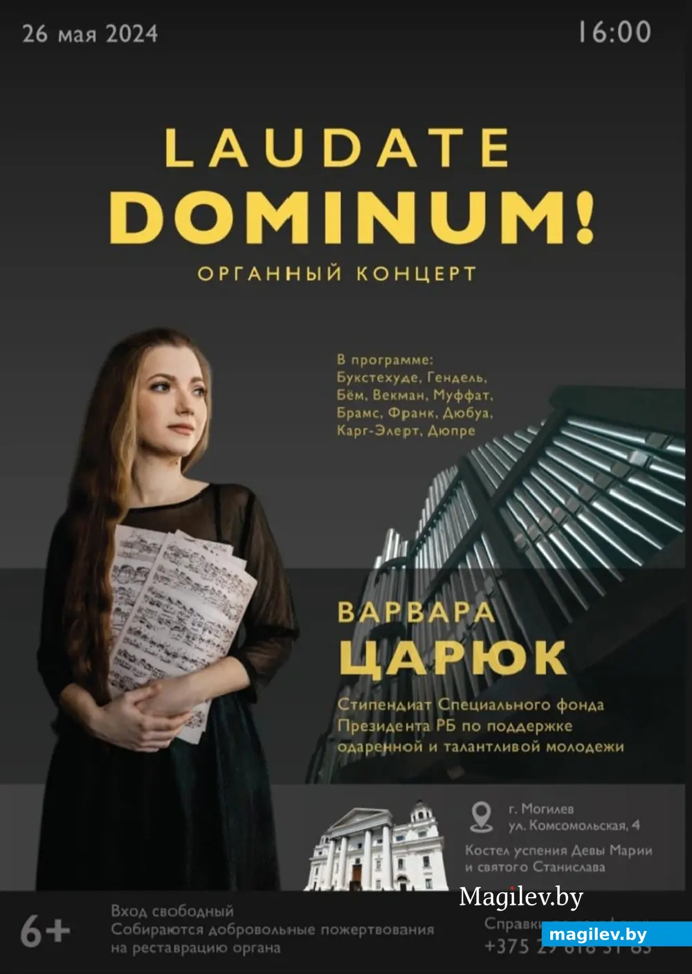Концерт состоится 26 мая в костеле Успения Девы Марии и Святого Станислава. Начало 16.00. Цена билета – 10 рублей. Дополнительную информацию можно получить по телефону: +375 29 618-31-63.