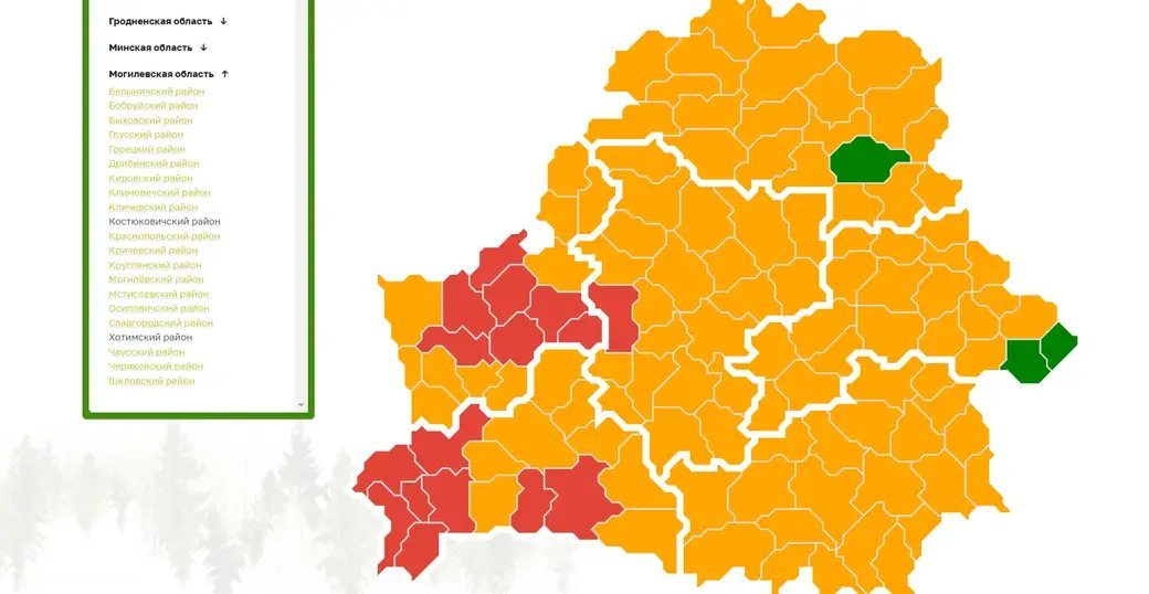 По данным интерактивной карты запретов и ограничений на посещение лесов Министерства лесного хозяйства РБ, ограничение введены на территории всей Могилевской области, за исключением двух районов.