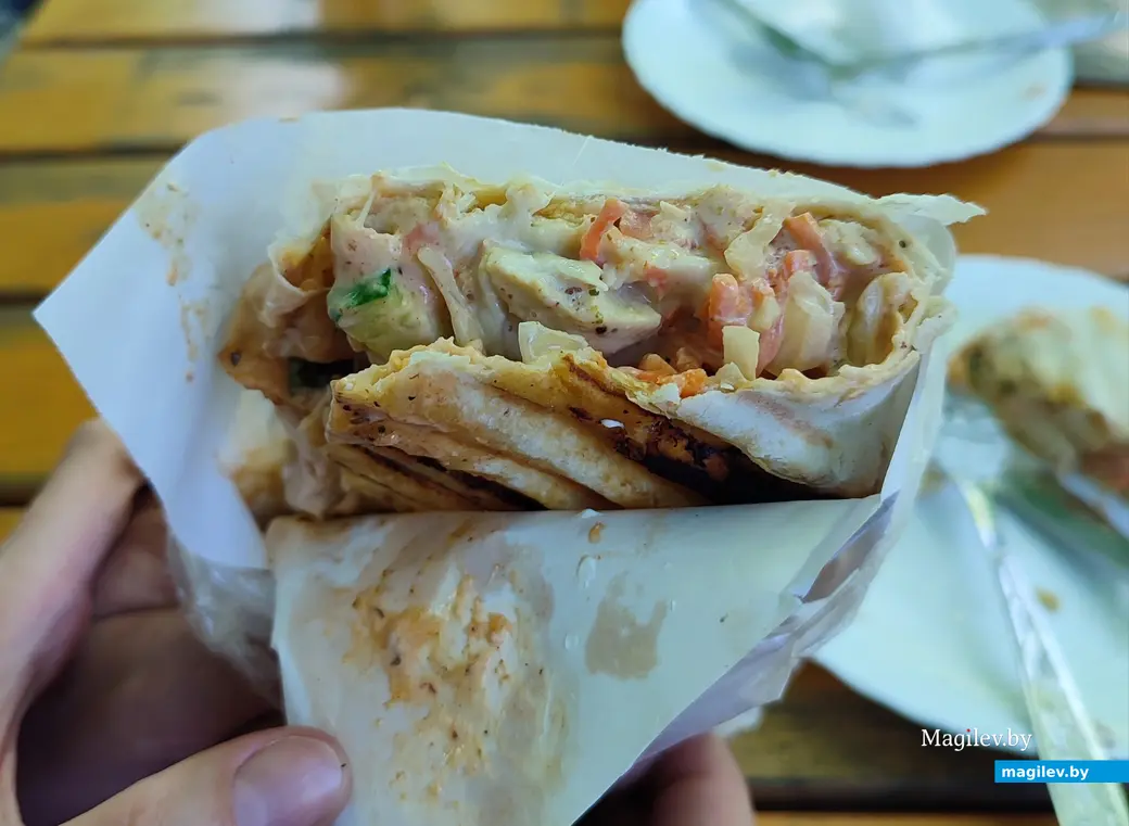 Мы взяли две порции драников и одну шаурму. Заплатили 22 рубля.