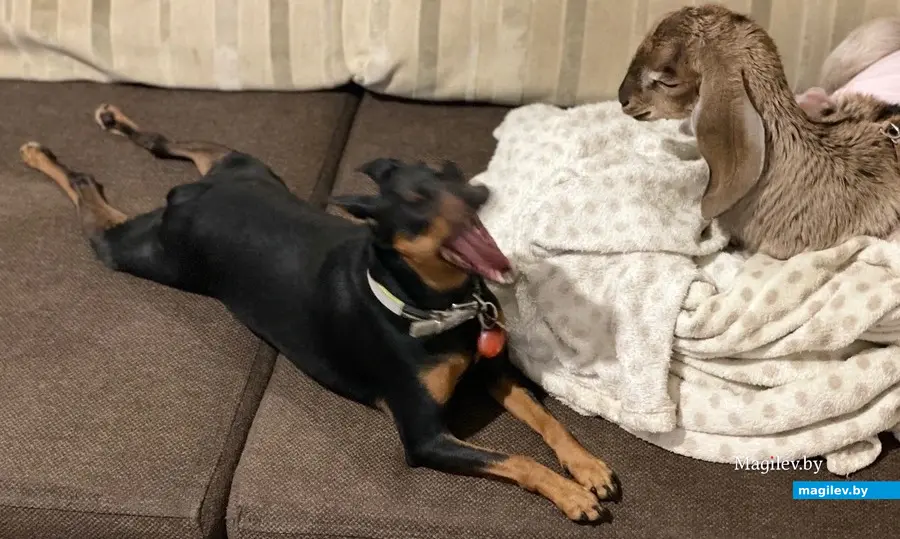 По словам собеседницы, изначально Доня не требовала большого ухода. Только ела козье молоко из бутылочки и спала. Позже в ее рацион добавили сено, очистки от морковки, огурцы, другие овощи. Сначала Доня спала на диване в гостиной, а потом «перебралась» к собаке в ее домик. У супругов есть собачка Герда породы цвергпинчер (мини доберман).