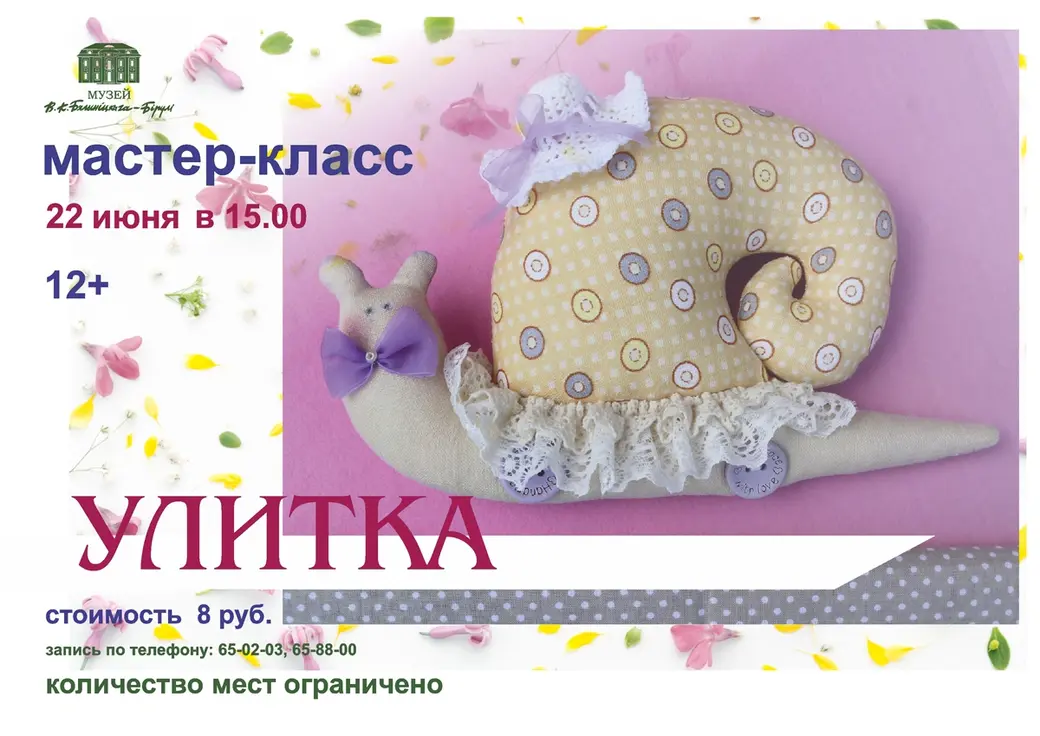 Мастер-класс «Улитка» состоится 22 июня. Начало в 15.00. Цена билета – 8 рублей. Забронировать билет можно по телефону: 80222-65-88-00, 65-02-03.