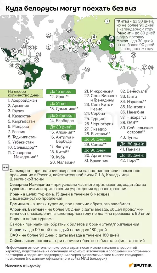 Смотрите в инфографике Sputnik Беларусь, что это за государства и на какое количество дней можно рассчитывать безвизовое путешествие.
