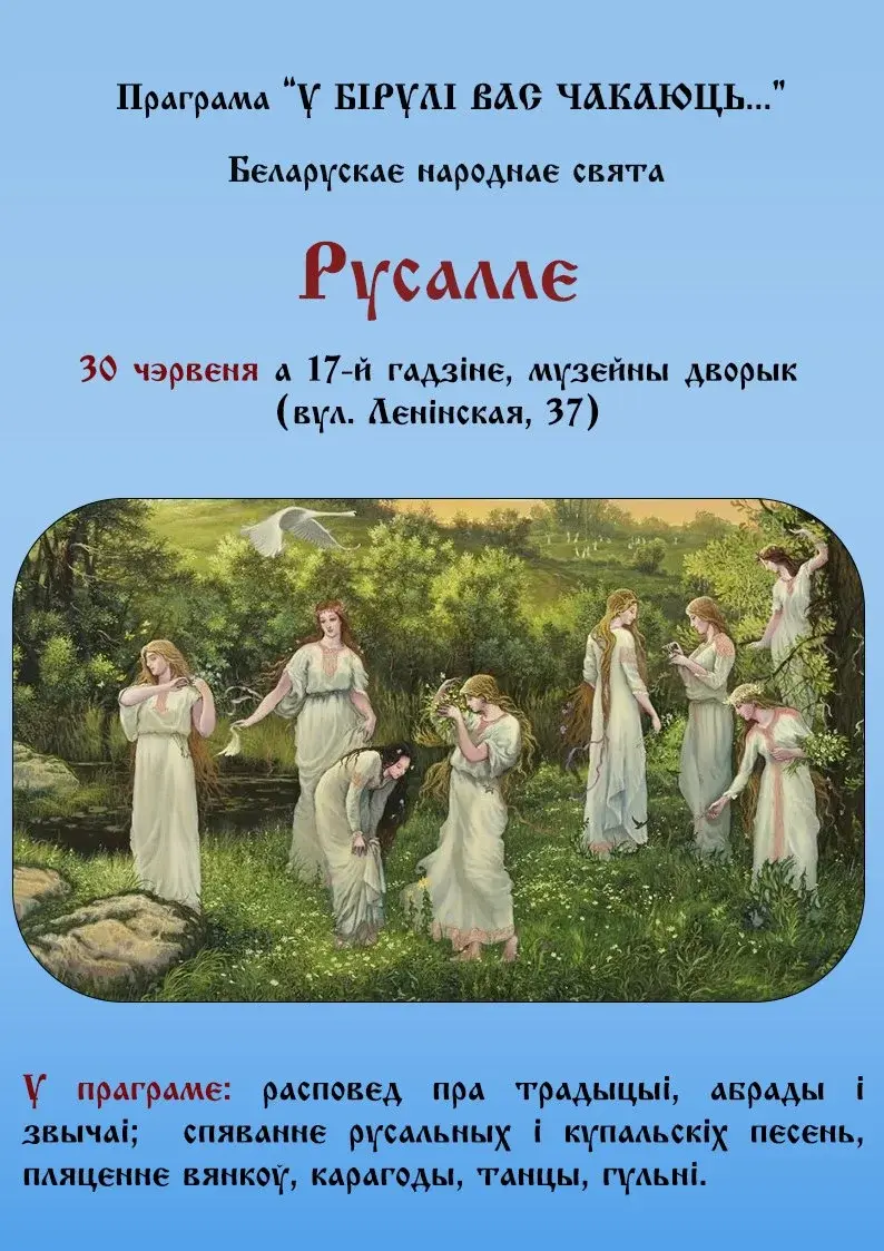 Тематическое мероприятие «Русалле» продолжит серию встреч программы музея Бялыницкого-Бирули «У Бірулі вас чакаюць». Оно состоится 30 июня. В программе: рассказ про традиции, обряды и обычаи Купалья, исполнение русальских и купальских песен, плетение венков, хороводы, танцы и игры.