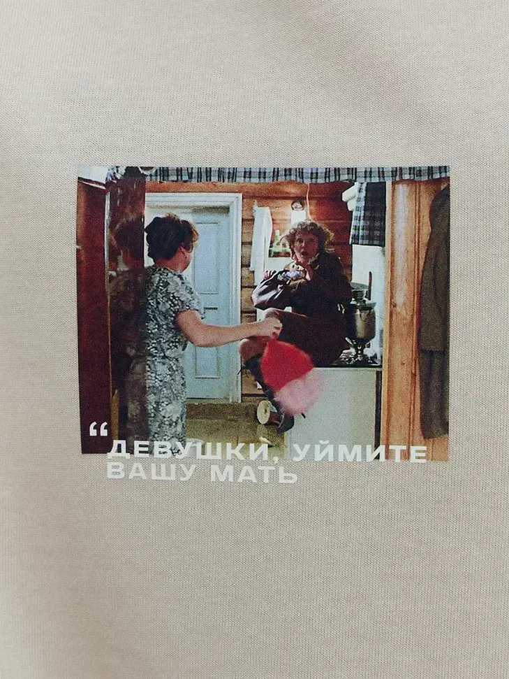На женских футболках обыграны фразы «Отличница! Комсомолка! Спортсменка!», «Девушки, уймите вашу мать!» и «А у вас нет такого же, но с перламутровыми пуговицами?».