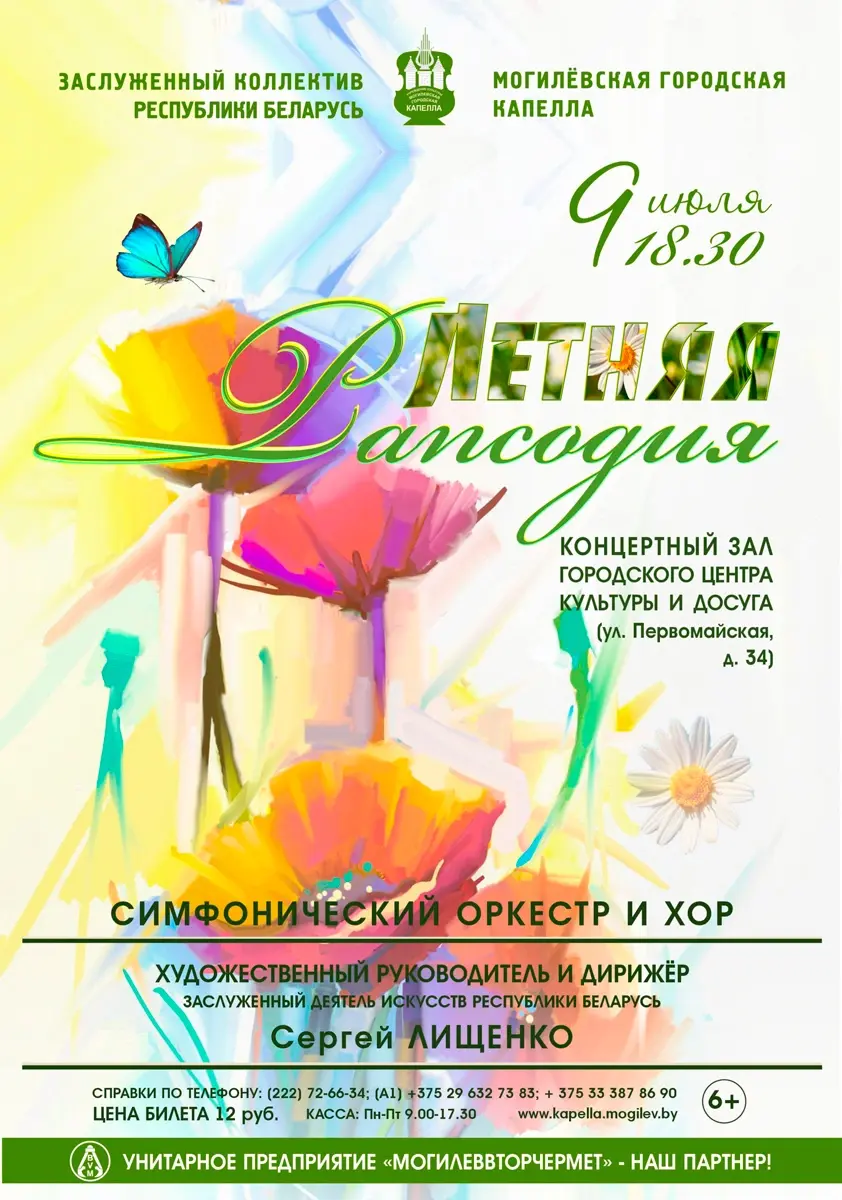 Традиционно июнем завершается концертный сезон Могилевской городской капеллы. В текущем его сроки чуть сдвинуты – перешли на июль. В его начале творческий коллектив под руководством Сергея Лищенко представит специальную «прощальную» программу – концерт «Летняя рапсодия», которая будет состоять из музыкальных произведений, посвященных любви и лету.