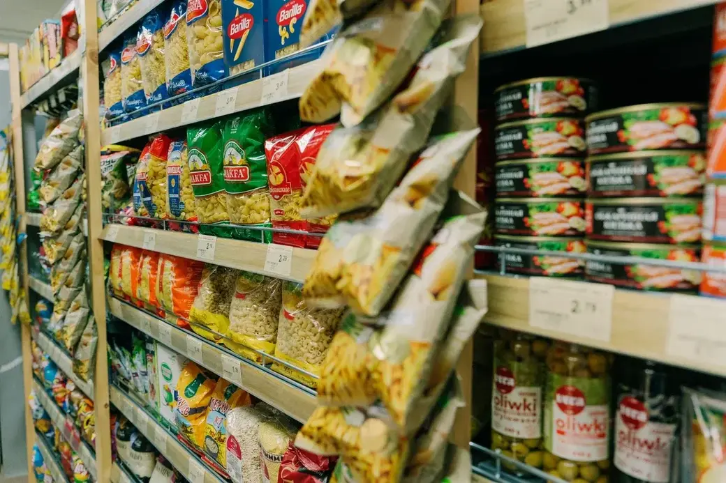 На мясной витрине представлены колбасы и мясные деликатесы, на молочной – сыры, творог, йогурты и десерты. Рядом выстроены стеллажи с бакалеей: крупами, макаронами, консервами, чаем, кофе, напитками и сладостями. Также можно найти фрукты и овощи. На видном месте – хлеб и другая выпечка. А еще тут есть товары для дома, бытовая химия и корм для животных.