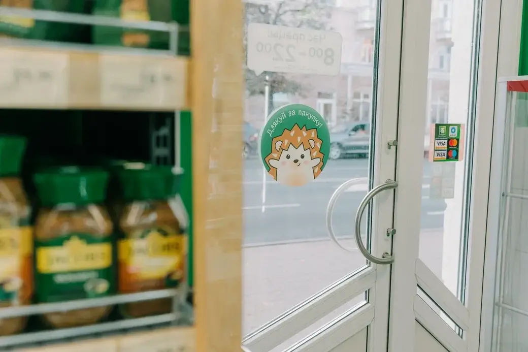 Внешне магазин «вписан» в уличное оформление: над входом установлена белая вывеска, а с дверей покупателей приветствует ежик. В интерьере присутствуют зеленый и желтый цвета. Надпись на стене воодушевляет: «нашы цэны не колюцца».