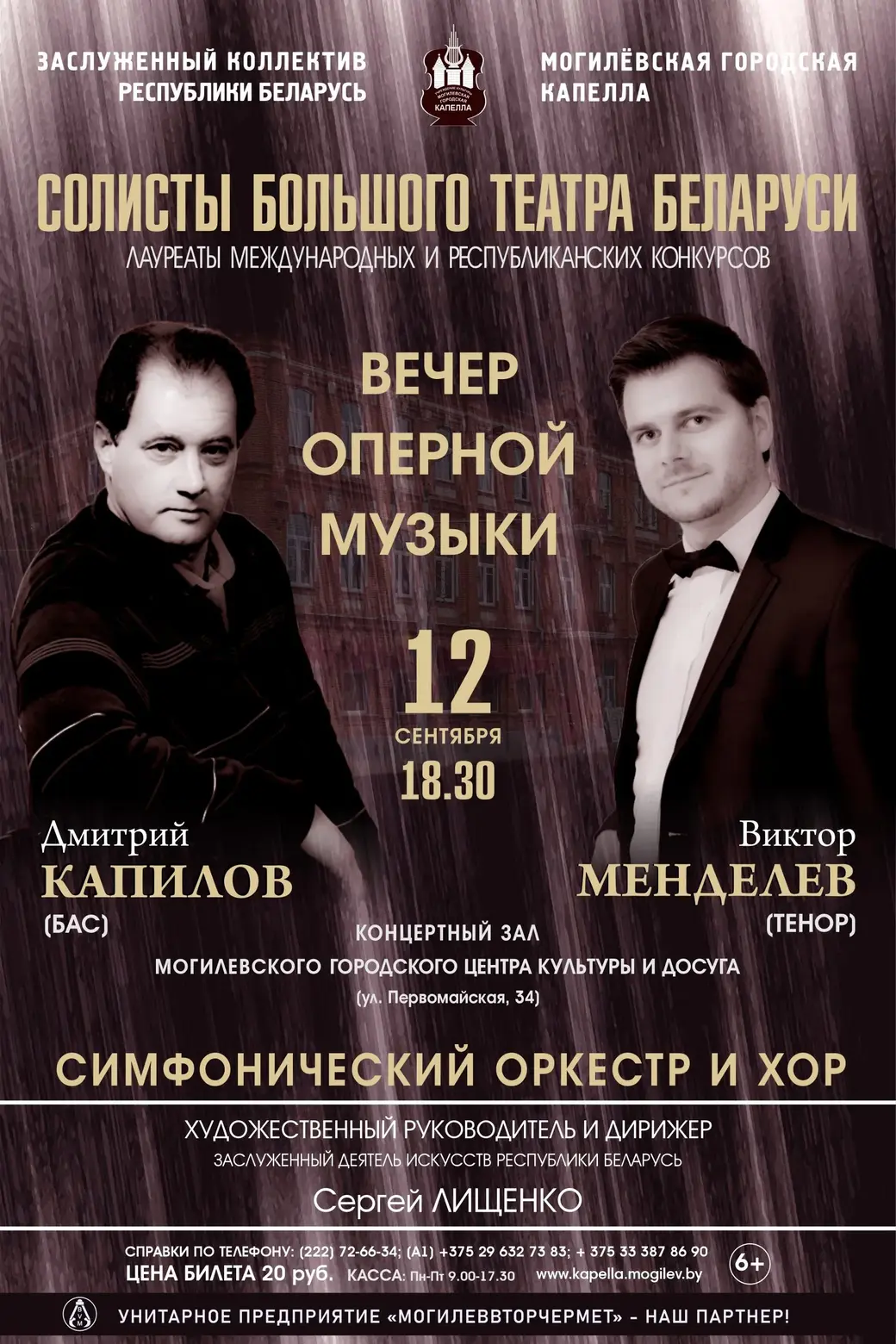 «Вечер оперной музыки» – так называется первый концерт капеллы в наступившем сентябре. В его программе – оперные шедевры. В концерте примут участие лауреаты международных и республиканских конкурсов, солисты Большого театра Беларуси Дмитрий Капилов (бас) и Виктор Менделев (тенор).