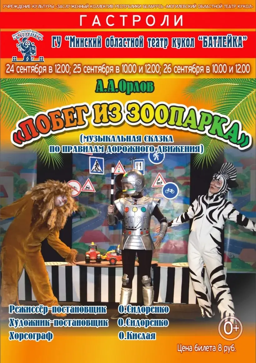 Спектакль «Побег из зоопарка» покажут на сцене Могилевского областного театра кукол 24 (начало в 12.00), 25 (начало в 10.00 и 12.00) и 26 сентября (начало в 10.00 и 12.00). Там же, в кассе театра, можно приобрести билеты на спектакль. Цена билета – 8 рублей. Телефон для справок:(0222) 71-30-15 (касса).