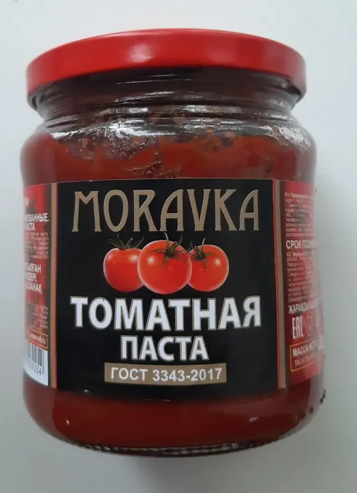 Томатная паста «МОРАВКА», страна производства – Россия. В ней нашли диоксид серы (Е220) – недопустимую добавку, которая не указана в составе. Кроме этого, массовая доля растворимых сухих веществ составила 24% при норме не менее 25%, поэтому данный продукт нельзя относить к томатной пасте.