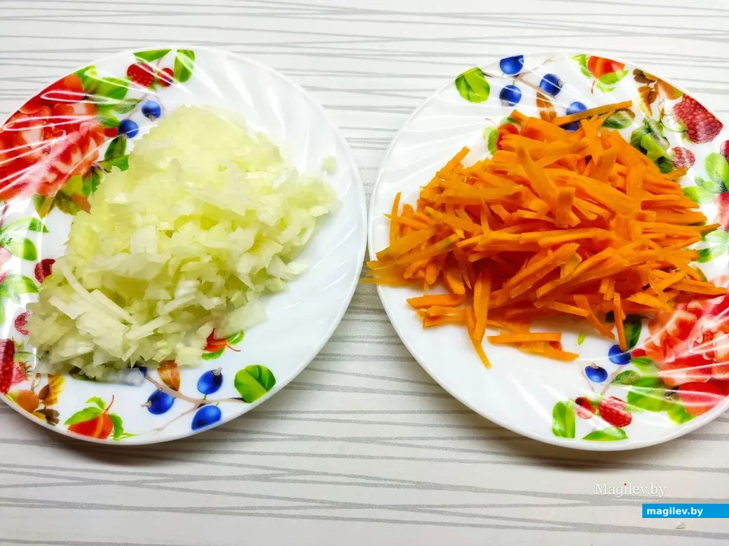 3. Лук нарезать кубиками, морковь нашинковать полосками.