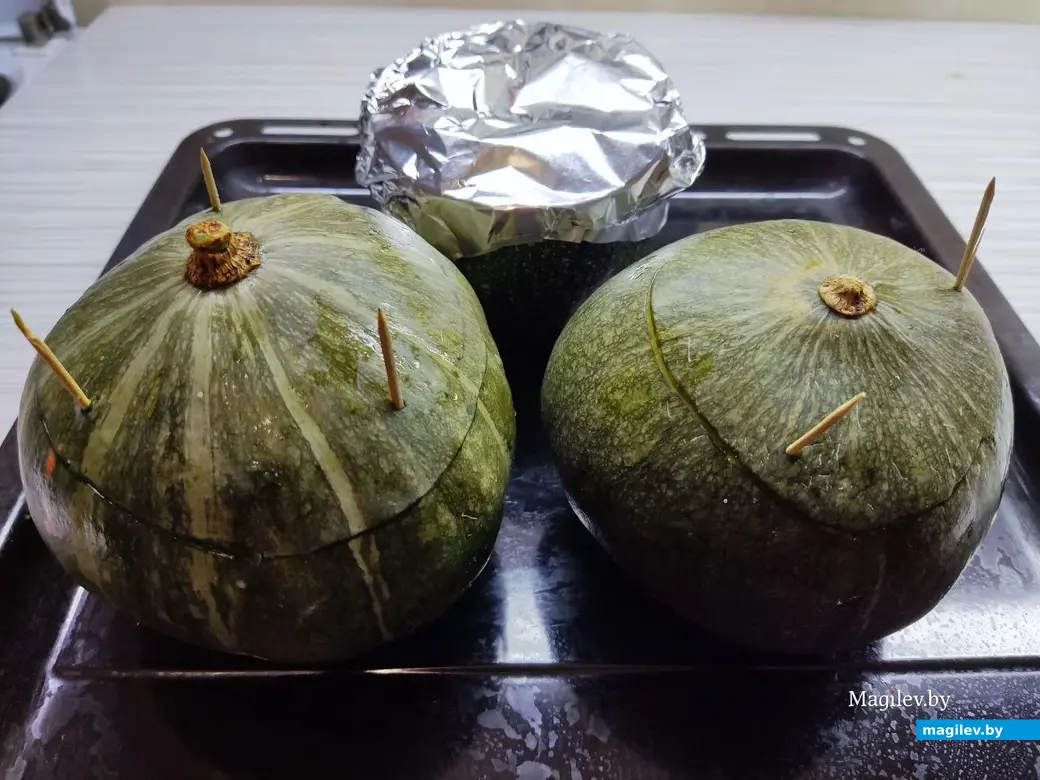 7. Внутреннюю часть каждой тыквы слегка присолить и наполнить их фаршем до самого верха, слегка уплотняя начинку. Накрыть «крышечкой» и зафиксировать ее при помощи зубочисток. У меня было всего две тыквы, поэтому оставшейся начинкой нафаршировала половину кабачка, подготовленного по тому же принципу. Сверху накрыла его сложенной вдвое фольгой.
