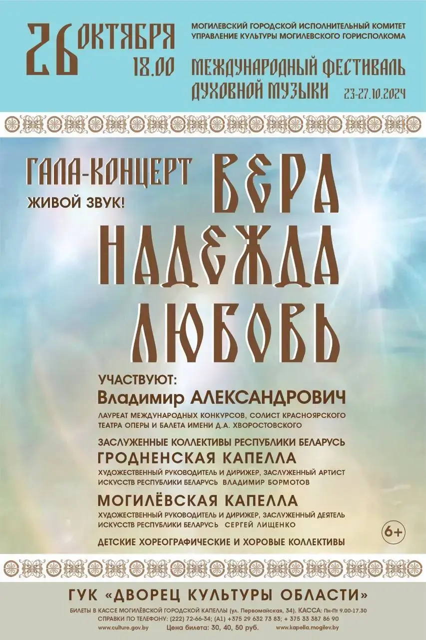 Масштабным мероприятием станет гала-концерт «Вера. Надежда. Любовь» с участием солиста Красноярского театра оперы и балета им. Д.А.Хворостовского Владимира Александровича; заслуженных коллективов Республики Беларусь Могилевской капеллы и Гродненской капеллы. Он состоится 26 октября во Дворце культуры области.