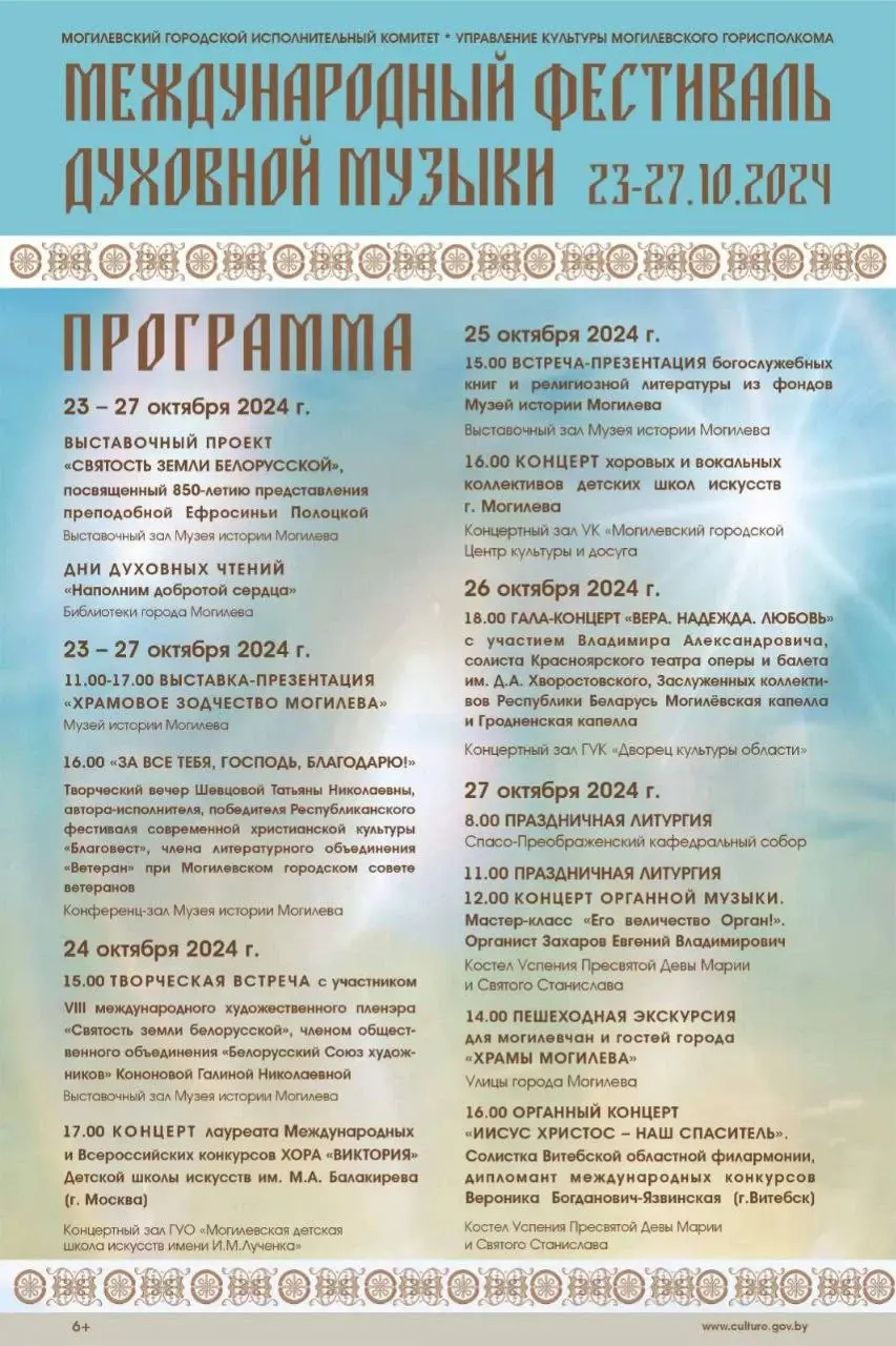 Фестиваль духовной музыки в Могилеве начнется 23 октября двумя выставочными проектами: в Выставочном зале Могилева и в Музее истории Могилева. На первой площадке она посвящена 850-летию представления преподобной Ефросиньи Полоцкой, на второй – храмовому зодчеству Могилева.