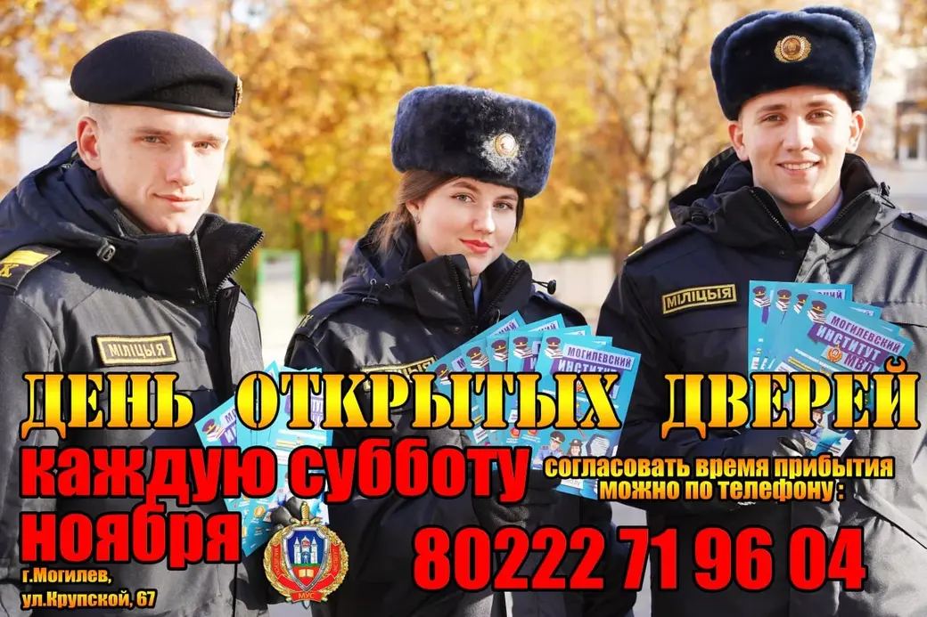Желающим посетить Могилевский институт МВД в одну из суббот ноября необходимо заранее согласовать время своего прибытия по телефону 8 (0222) 71-96-04 или написать сообщение в официальные аккаунты вуза в социальных сетях.