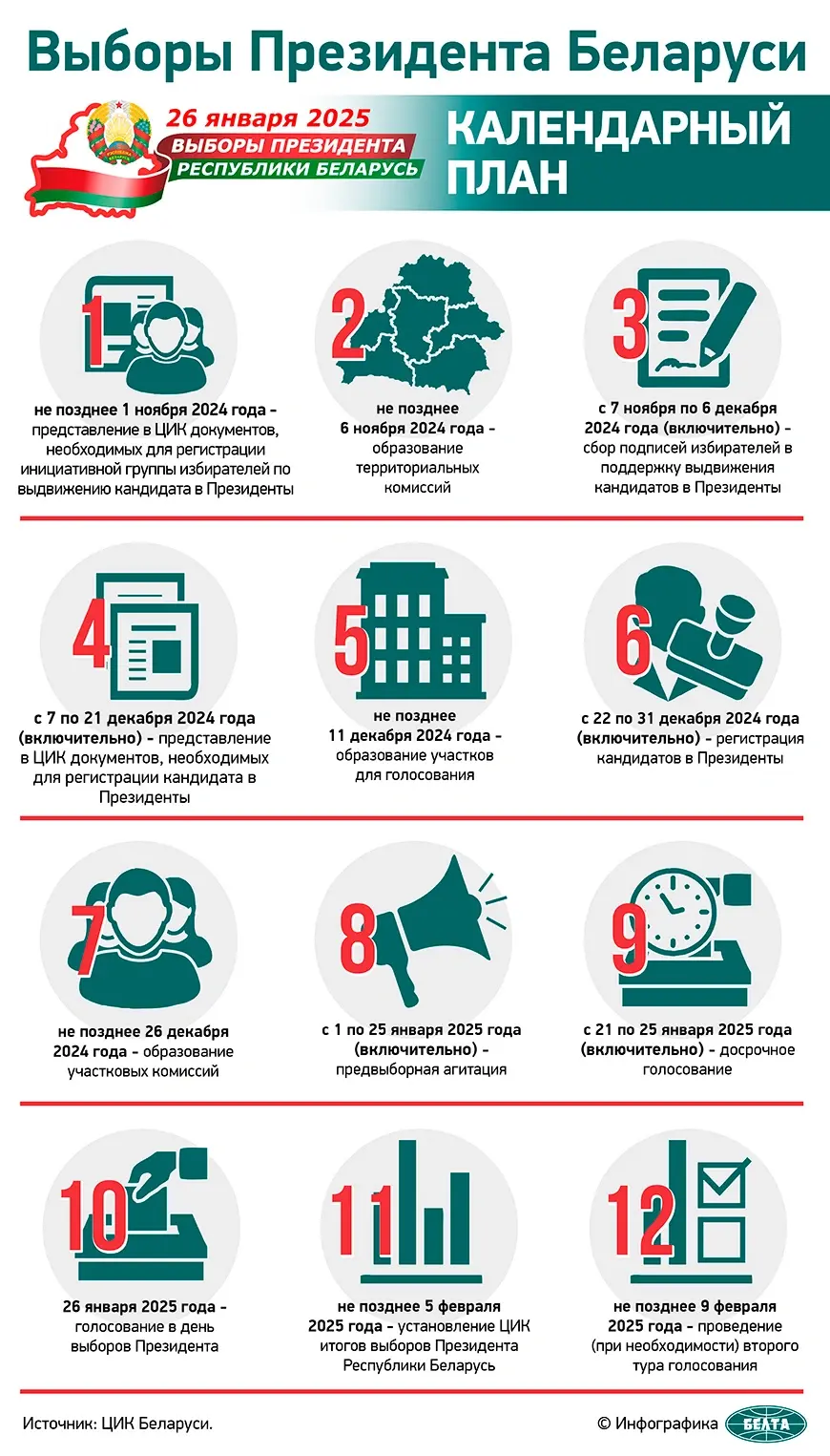Чтобы получить официальный статус кандидата в президенты, инициативным группам необходимо собрать не менее 100 тысяч подписей. Этот этап электоральный кампании будет проходить с 7 ноября по 6 декабря, после чего ЦИК проверит подписи и зарегистрирует кандидатов. Предвыборная агитация начнется 1 января и завершится 25 января 2025 года, а выборы, напомним, состоятся 26 января.