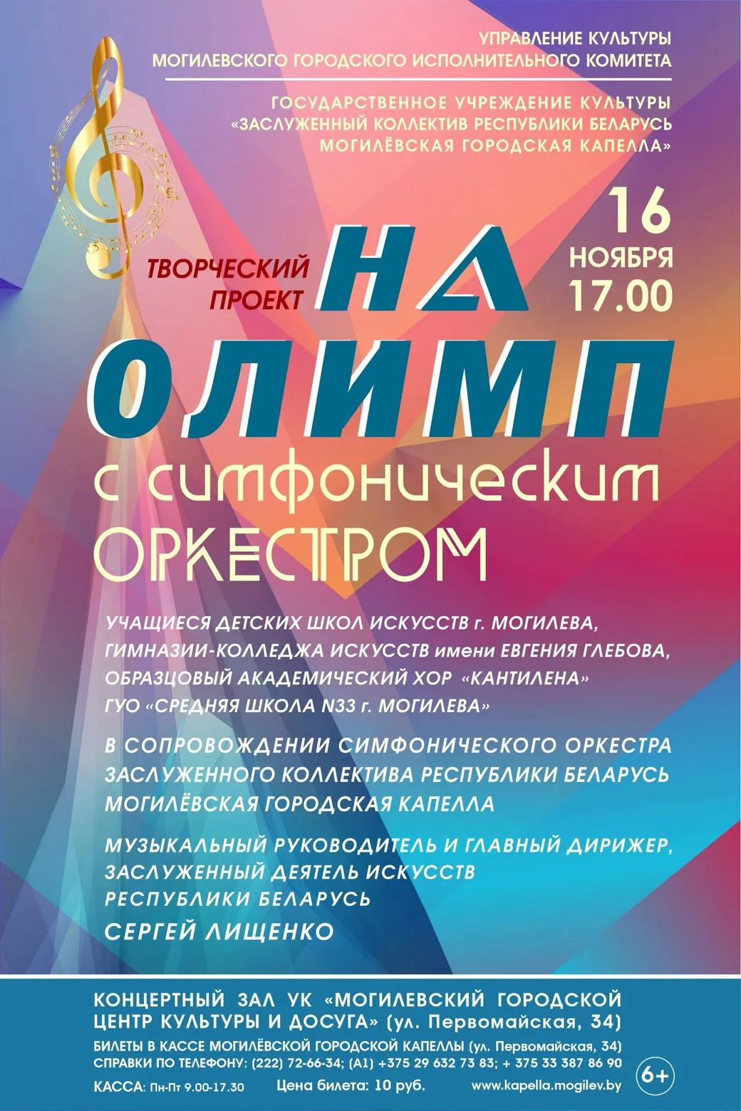 Концерт «На Олимп с симфоническим оркестром!» состоится 16 ноября. Начало в 17.00. Цена билета – 10 рублей. Справка по телефону: 80222-72-66-34.