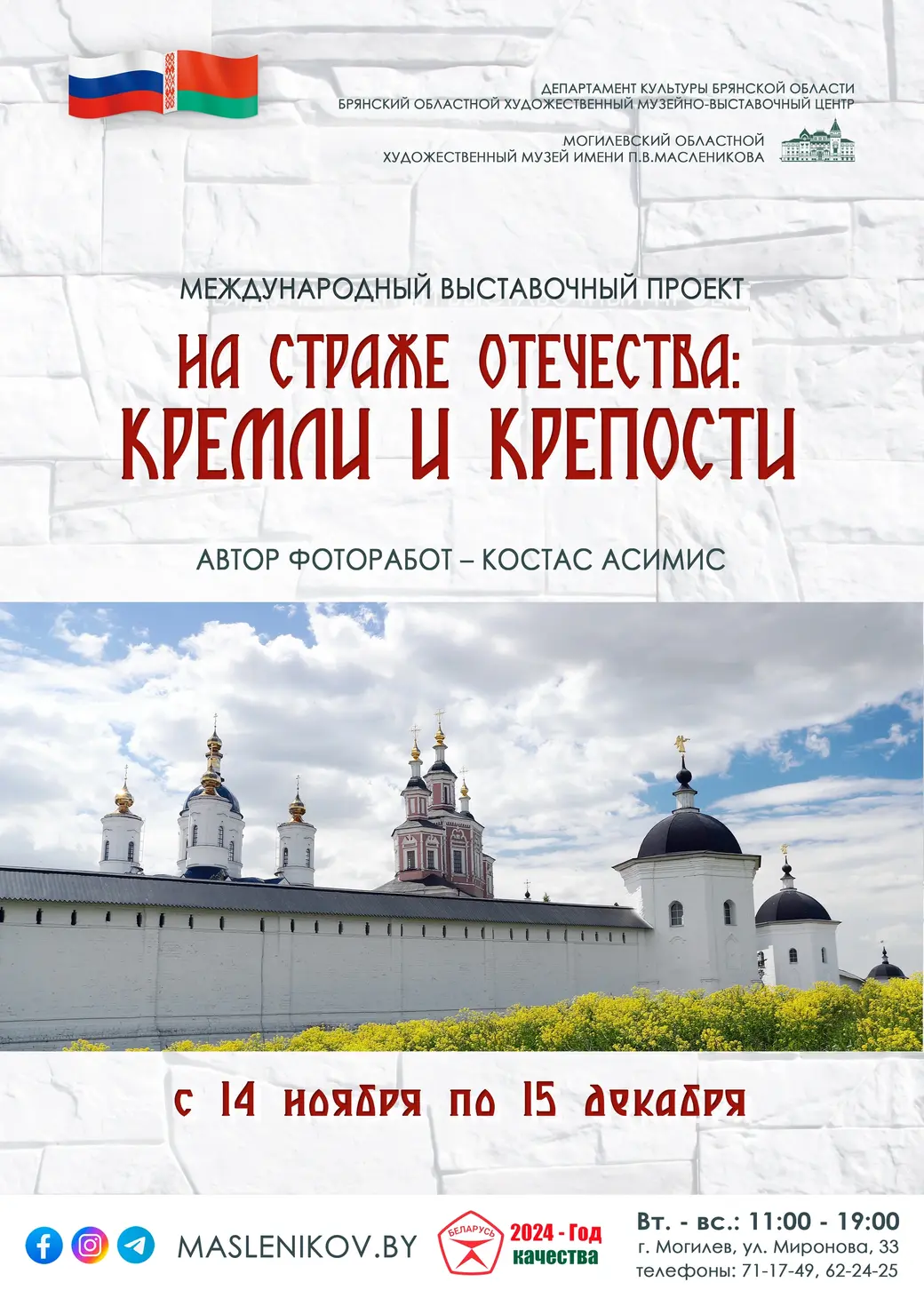 Выставка «На страже Отечества: кремли и крепости» будет работать в Могилевском областном художественном музее имени Павла Масленикова с 14 ноября по 15 декабря. Телефон для справок: 80222-71-17-49.