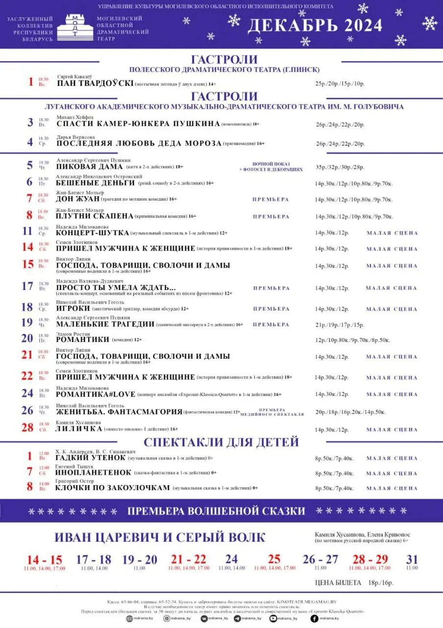 Вот подробная афиша декабря. На протяжении месяца в ней возможны изменения. Справка по телефону: 80222-65-52-34.