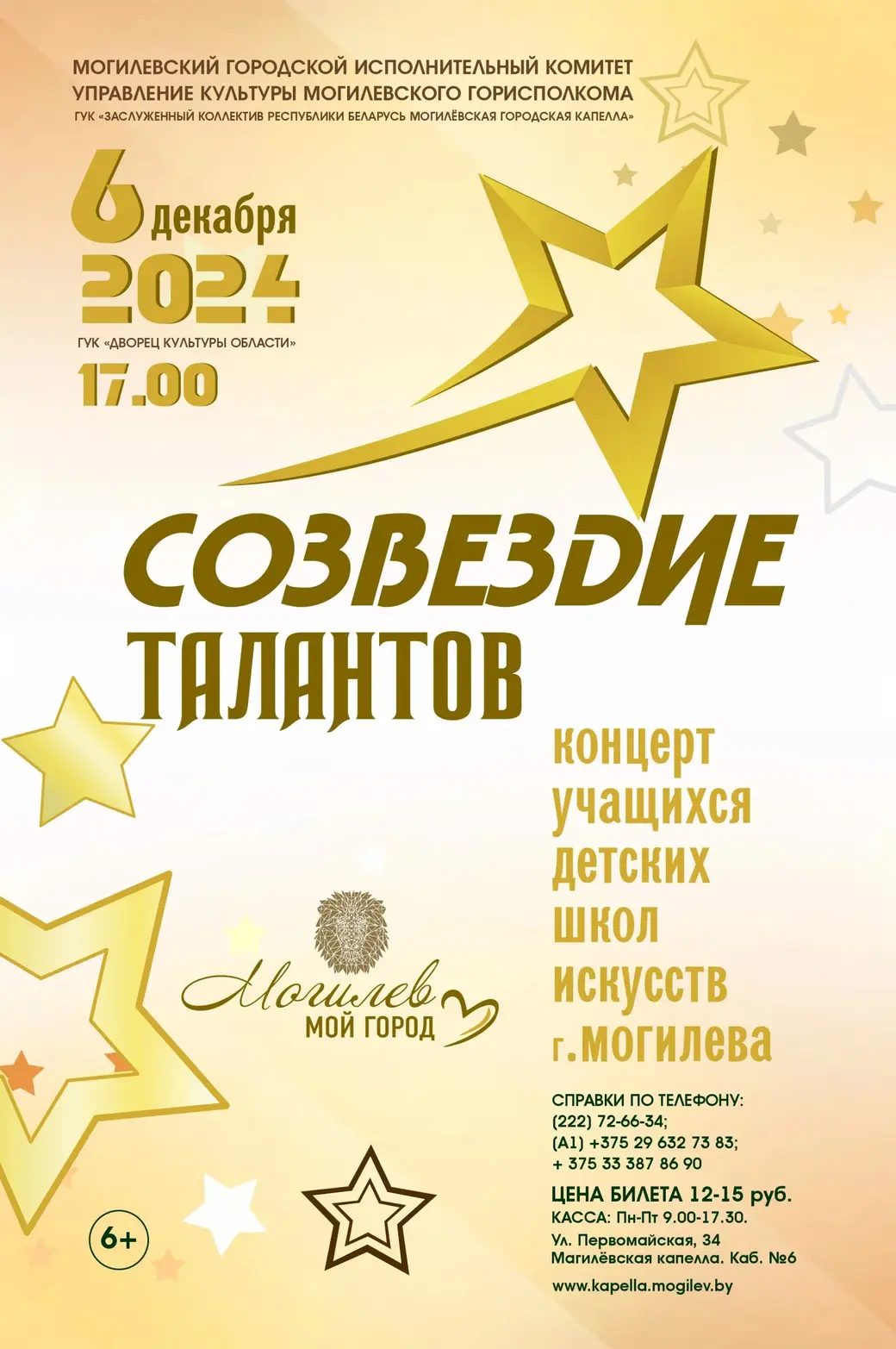 «Созвездие талантов» – так называется концертная программа, которая будет состоять из лучших выступлений учащихся детских школ искусств Могилева. Сопровождать концертные номера юных дарований будет оркестр Заслуженного коллектива Республики Беларусь Могилевская городская капелла под руководством Сергея Лищенко.