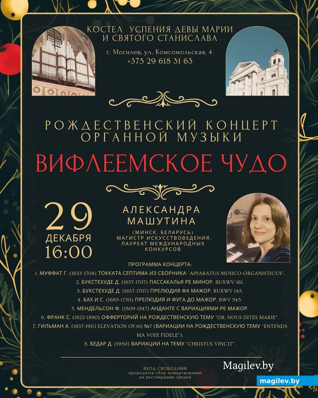 Концерт состоится 29 декабря. Начало в 16.00. Вход – пожертвования на реставрацию органа. Справка по телефону: +37529-618-31-63.