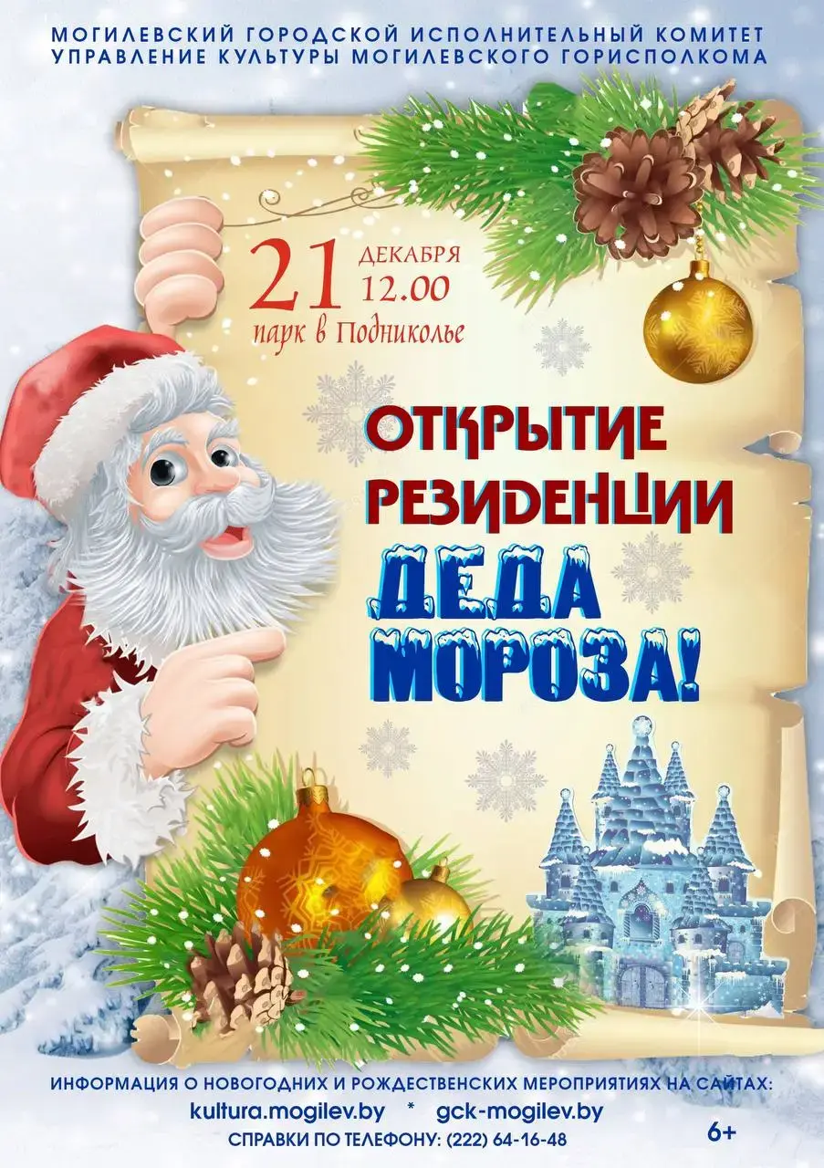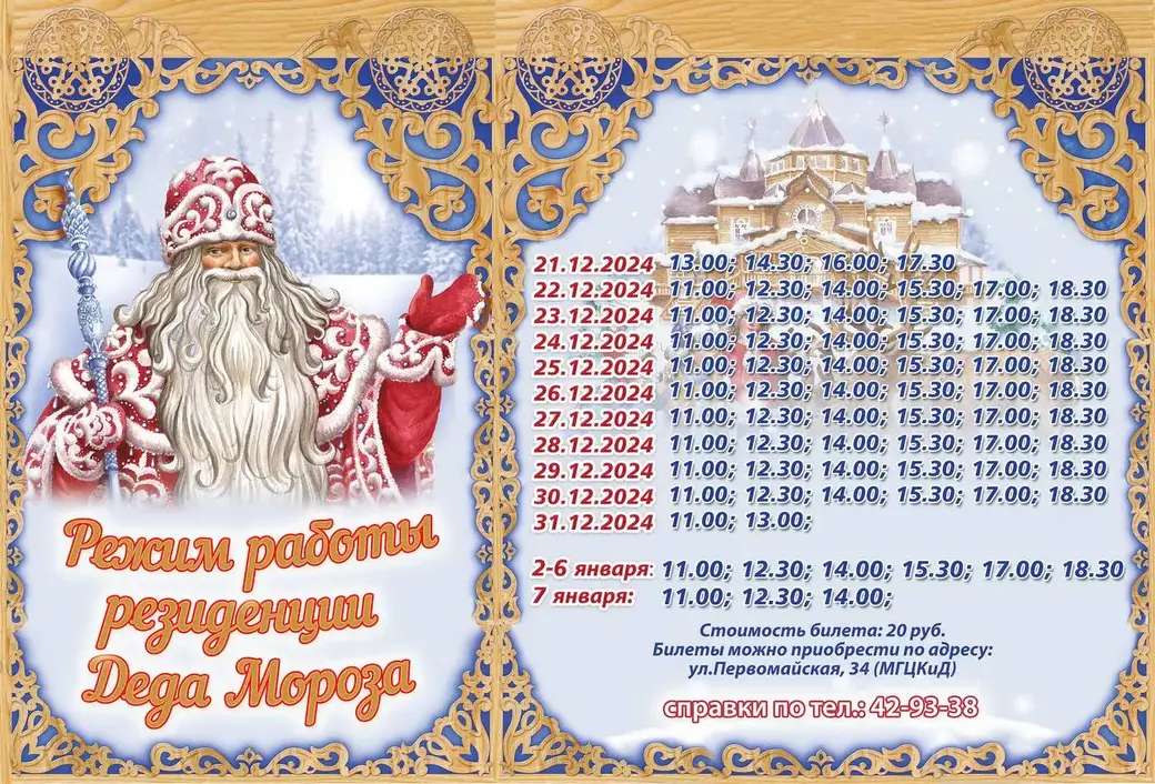 Посещение резиденции Деда Мороза платное: цена билета – 20 рублей. На каждое представление формируется группа до 15 человек. Заказать и приобрести билеты можно в Могилевском городском Центре культуры и досуга по адресу: ул. Первомайская, 34. Справка по тел: 8 0222 42 93 38.