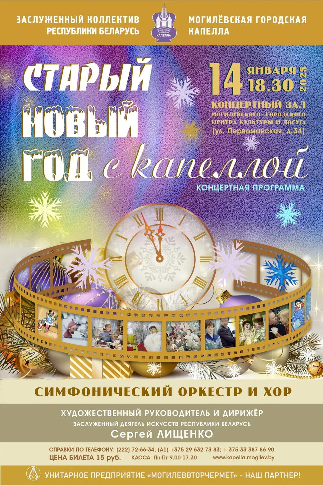 «Старый Новый год с капеллой» – так называется концертная программа Могилевской городской капеллы, которая будет состоять из популярных хитов кино и мультфильмов. Их песни давно обрели самостоятельную жизнь и стали для многих поколений путешествием в прошлое – во времена их детства и юности, полных надежд и планов, важных и дорогих сердцу событий в жизни.