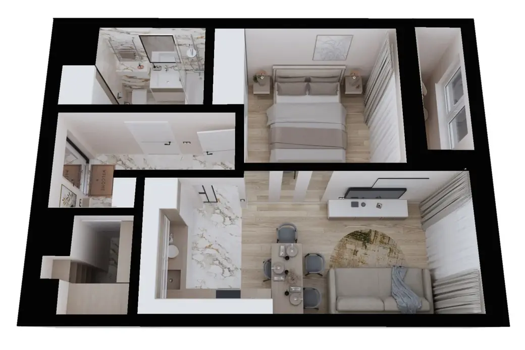 Дизайнер Анна Асаевич рассказала, что разыгрываемая квартира изначально не имеет планировки по комнатам, только выделенное место для санузла. Разработанный ею дизайн-проект предполагает для каждой комнаты отдельный вход. Гостиная совмещена с кухней, там есть обеденный стол, раскладной диван и тумба под телевизор.