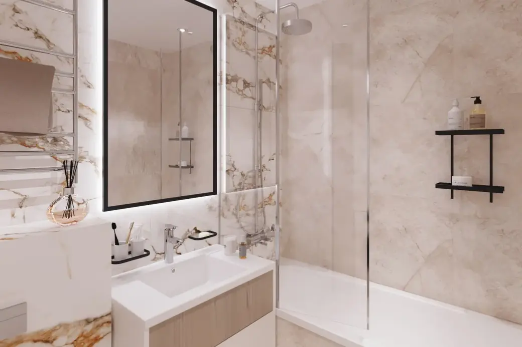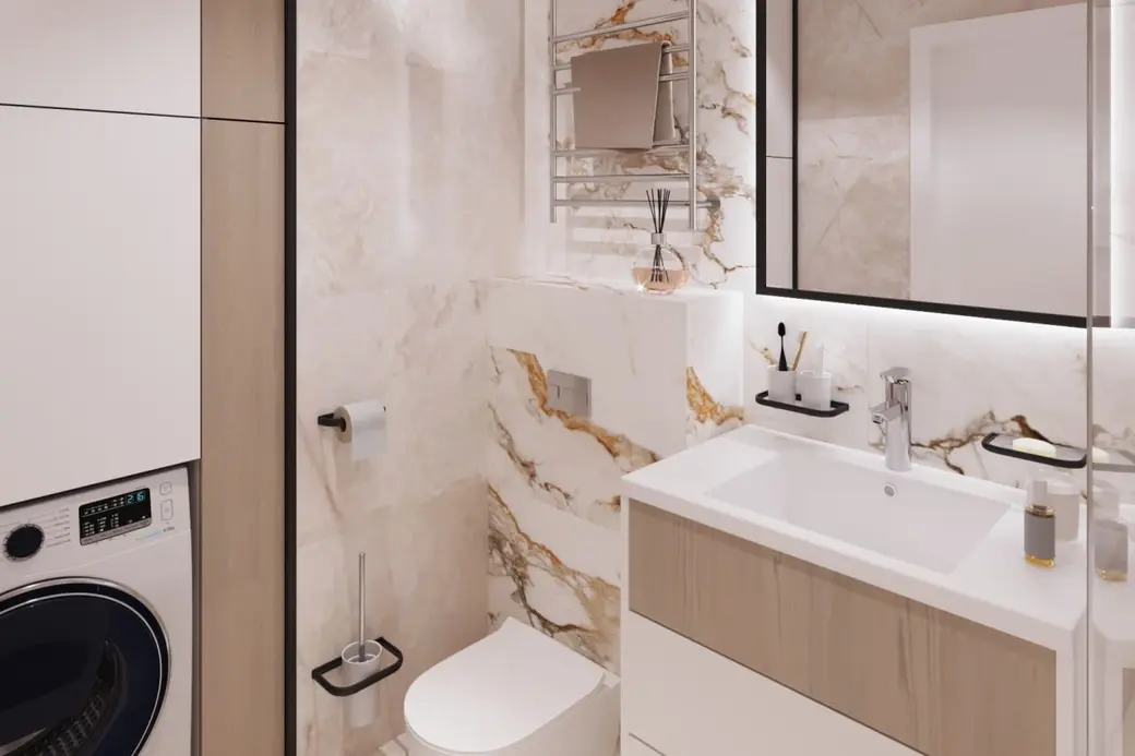 В санузле акцентная стена может быть отделана под мрамор, а фоновые – под песочный камень. Такая плитка никогда не выйдет из моды: хорошо подходит как для классических, так и для современных интерьеров. Для стен же предложена отделка обоями с мягкой текстурой под велюр.