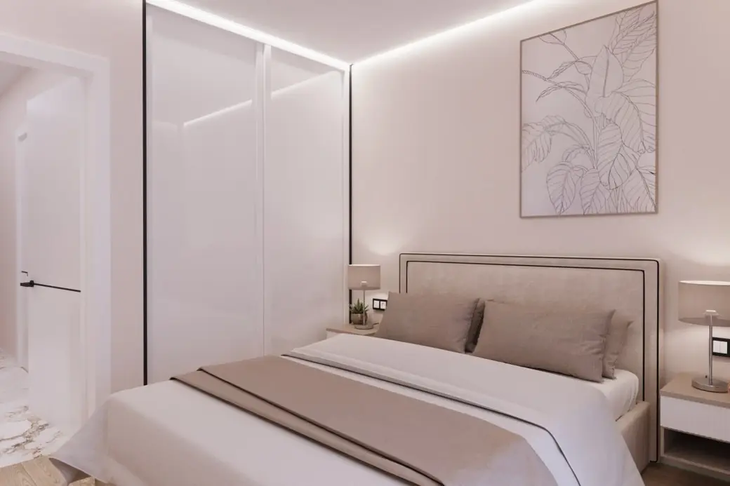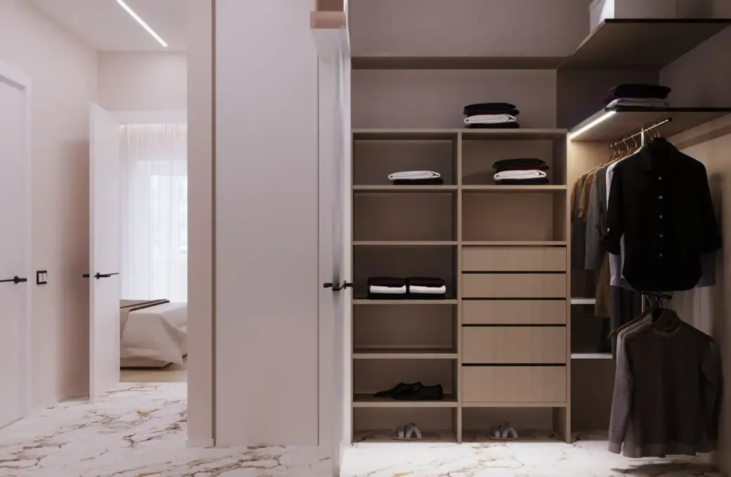 В спальне предлагается разместить двуспальную кровать, две прикроватные тумбочки и шкаф. В санузле запланированы ванная, унитаз с инсталляцией, умывальник, стиральная машина с шкафом для хранения бытовых вещей. А в прихожей дизайнер выделила место под гардеробную, небольшого шкафа для верхней одежды.