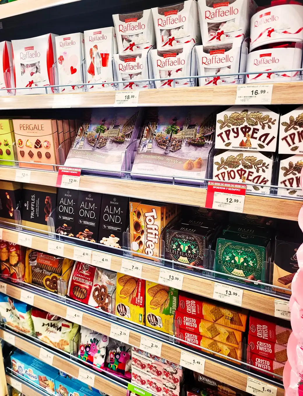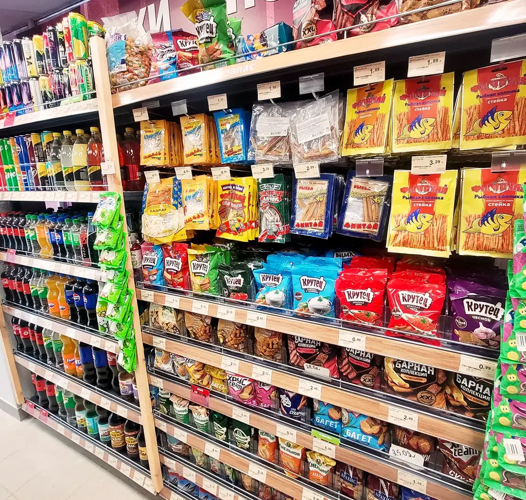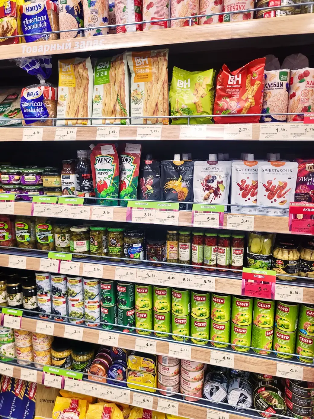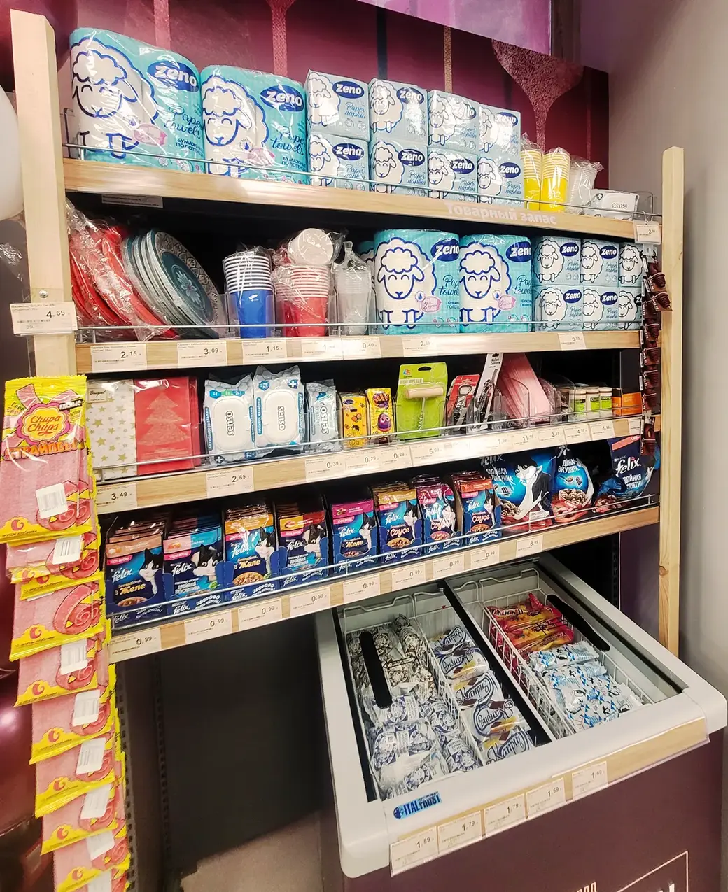 Выбор продуктов также разнообразен: колбасы, мясные нарезки, рыба, паштеты и хумусы. В наличии сыры различных сортов – мягкие, творожные, плавленые и копчёные. Для перекуса доступны чипсы, сухарики и орехи. Любители сладостей могут порадовать себя шоколадом, печеньем, конфетами и вафлями. Кроме того, в магазине представлены экзотические продукты, такие как кокосовое молоко, испанские оливки, маринованные луковицы, соусы песто и болоньезе.