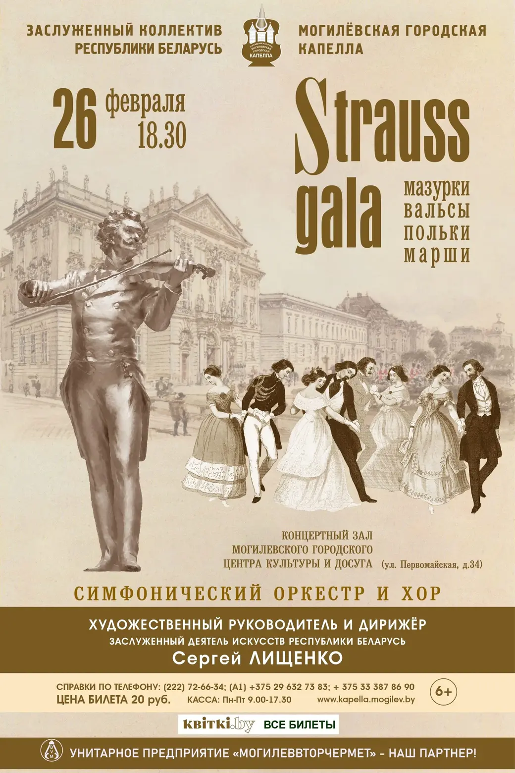 «Strauss gala» – так называется новая концертная программа Могилевской городской капеллы под руководством Сергея Лищенко. В ее составе известные и популярные музыкальные произведения Иоганна Штрауса – признанного короля вальса: за свою жизнь Иоганн Штраус создал 496 произведений, в том числе 168 вальсов, 117 полек, 73 кадрили, 43 марша, 31 мазурку, 15 оперетт, комическую оперу и балет.