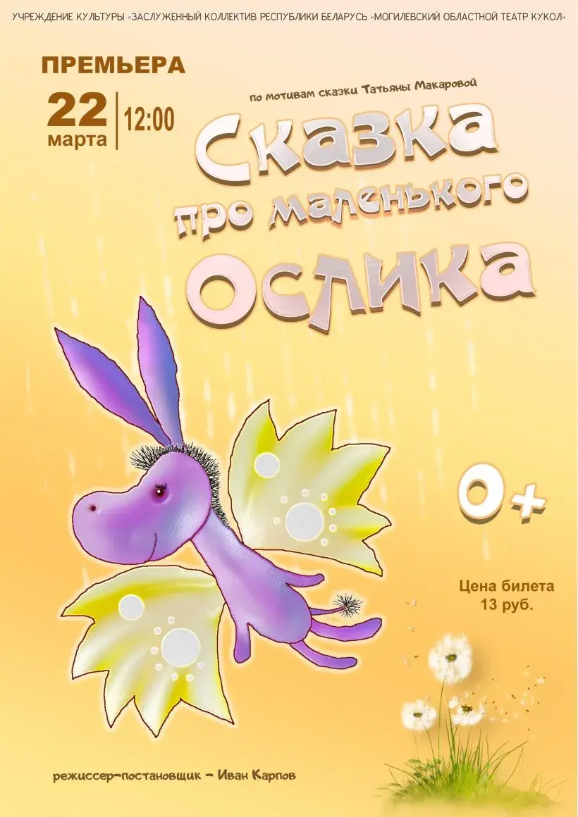 Премьера спектакля «Сказка про маленького Ослика» состоится 22 марта в Могилевском областном театре кукол. Начало в 12.00. Цена билета – 12 руб. Справка по телефонам: 8 0222 71-30-15; 70-89-72.