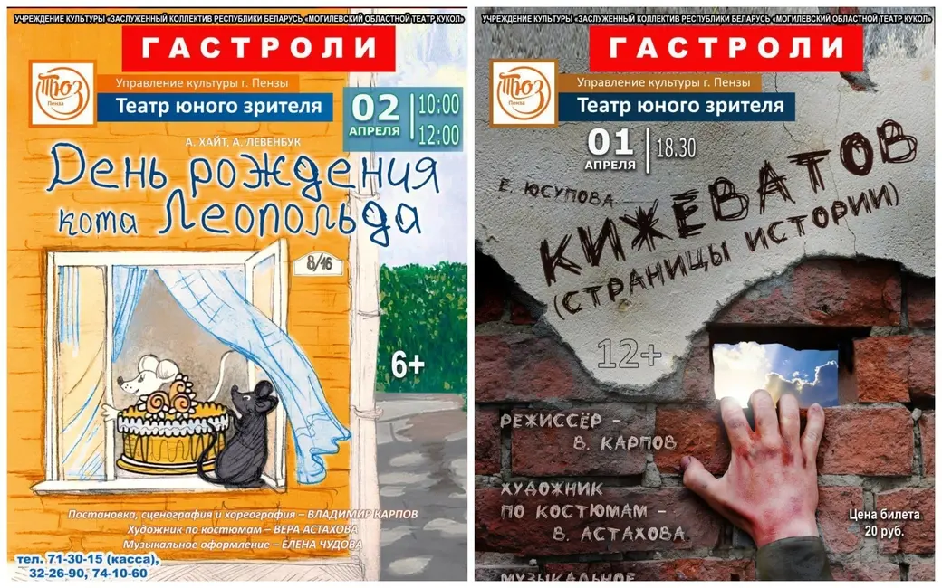 С 1 по 2 апреля на сцене Могилевского областного театра кукол состоятся гастроли Пензенского театра юного зрителя. В программу вошли два спектакля: «День рождение кота Леопольда» и «Кижеватов (Страницы истории)».