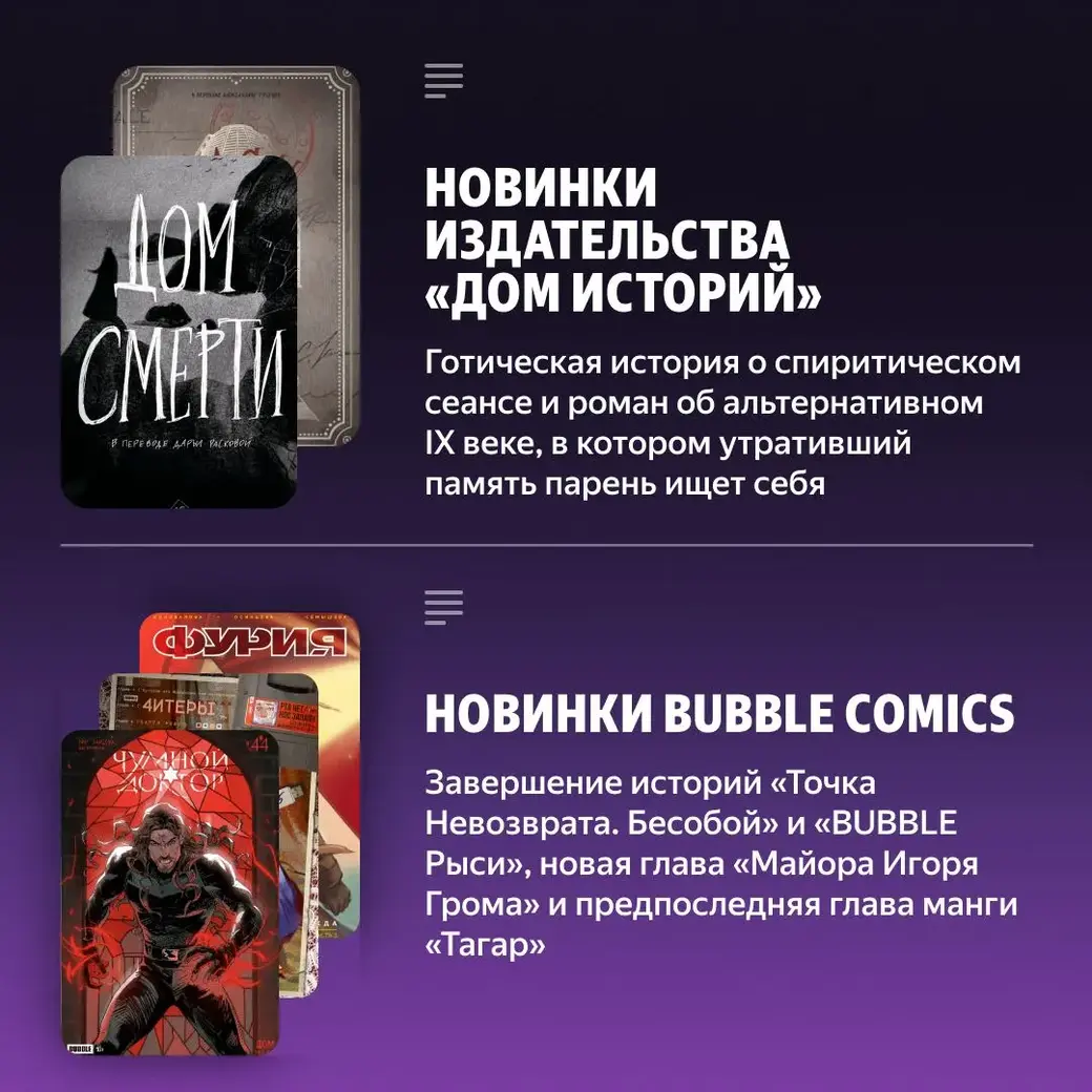 Для поклонников российских комиксов – новые выпуски Bubble Comics. Среди них – свежая глава «Майора Ивана Грома», завершение историй «Точка невозврата. Бесобой» и «Bubble Рыси».