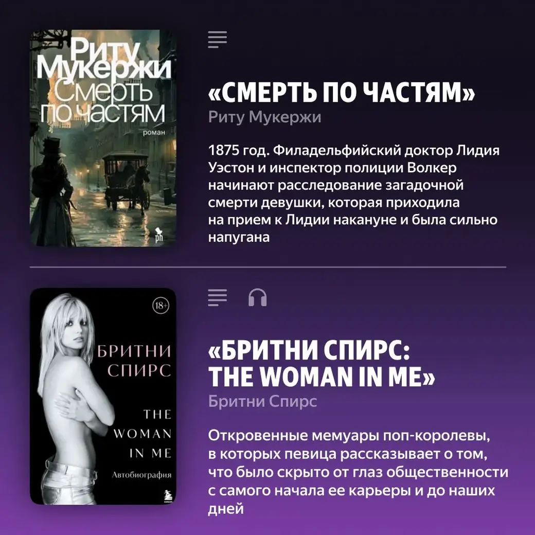 В Яндекс Книгах также вышла автобиография Бритни Спирс «The Woman in Me». Жизнь поп-звезды – это не только сцена, слава и миллионы поклонников, но и борьба за свободу, предательство, контроль со стороны семьи и попытки вырваться из-под давления.
