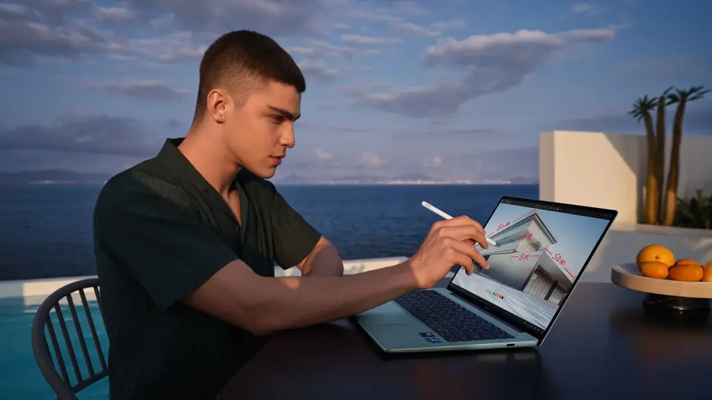 Новинка оснащена 14,2-дюймовым сенсорным OLED-экраном с разрешением 2,8K (2880 x 1920 точек), который обеспечивает флагманское качество картинки. Благодаря тонким рамкам полезная площадь дисплея составляет 91%. Соотношение сторон 3:2 хорошо подходит для работы с большими текстами и таблицами.
