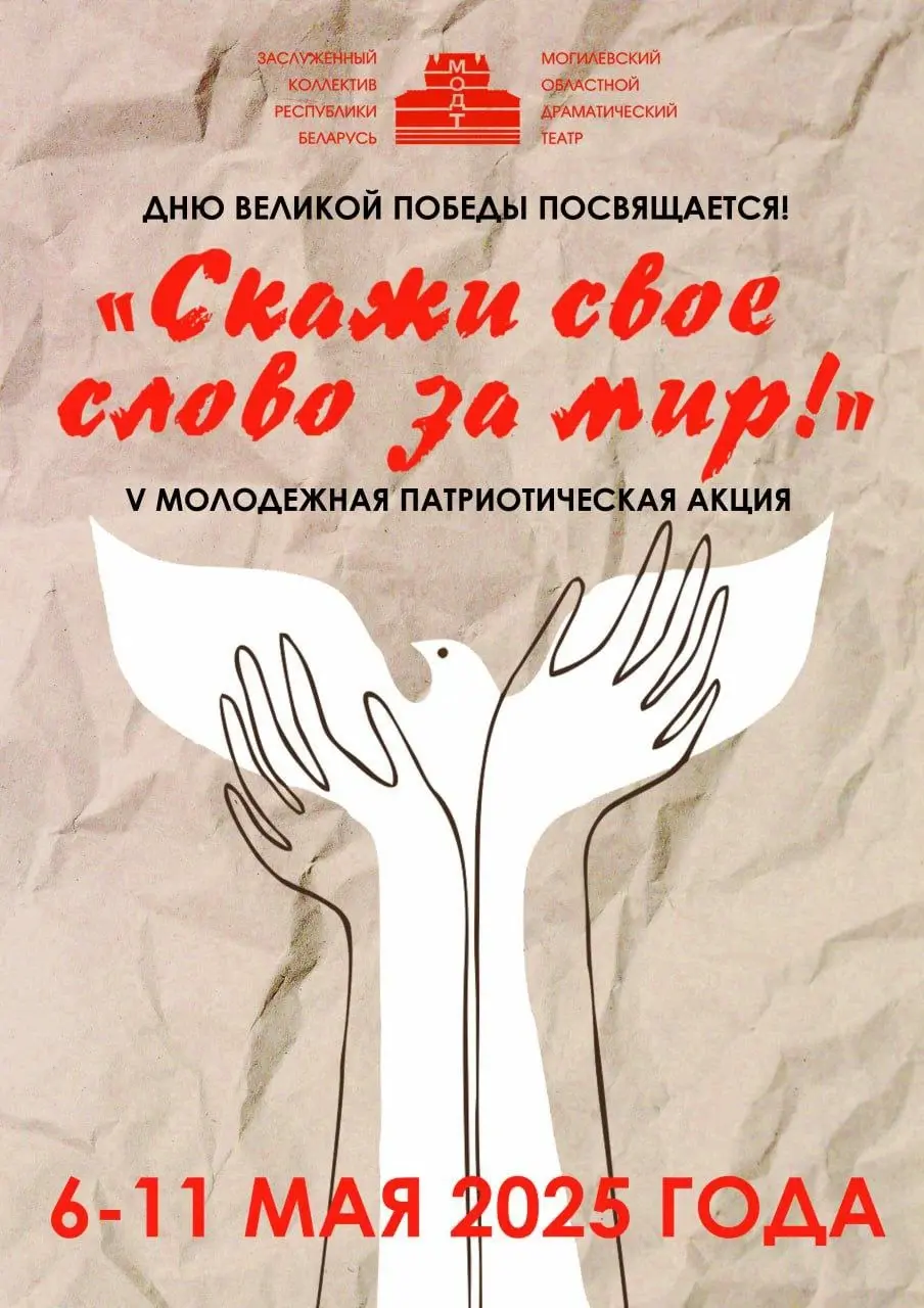 В рамках V Молодежной патриотической акции «Скажи свое слово за мир!», которая пройдет с 6 по 11 мая, в Могилевском областном драматическом театре пройдут следующие мероприятия: