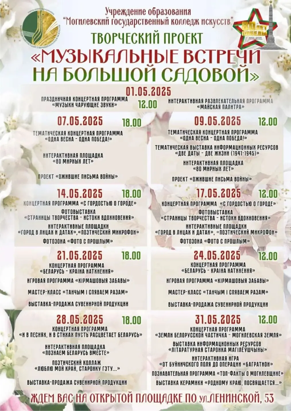 Творческий проект «Музыкальные встречи на Большой Садовой» Могилевского государственного колледжа искусств стартует в Могилеве 1 мая. В этот день на открытой площадке по улице Ленинской, 53 состоится концерт «Музыки чарующие звуки». Также в программе развлекательный интерактив «Майская палитра». Начало в 12.00.