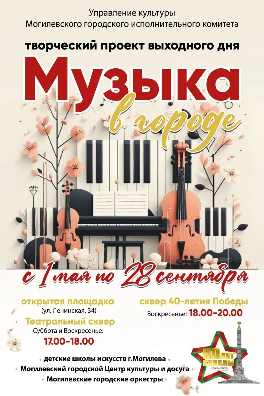 «Музыка в городе» – так называется творческий проект, в рамках которого в Могилеве с 1 мая по 28 сентября на открытых площадках в разных точках центральной части города будут выступать коллективы и исполнители детских школ искусств Могилева, Могилевского городского Центра культуры и досуга, а также Могилевских городских оркестров.