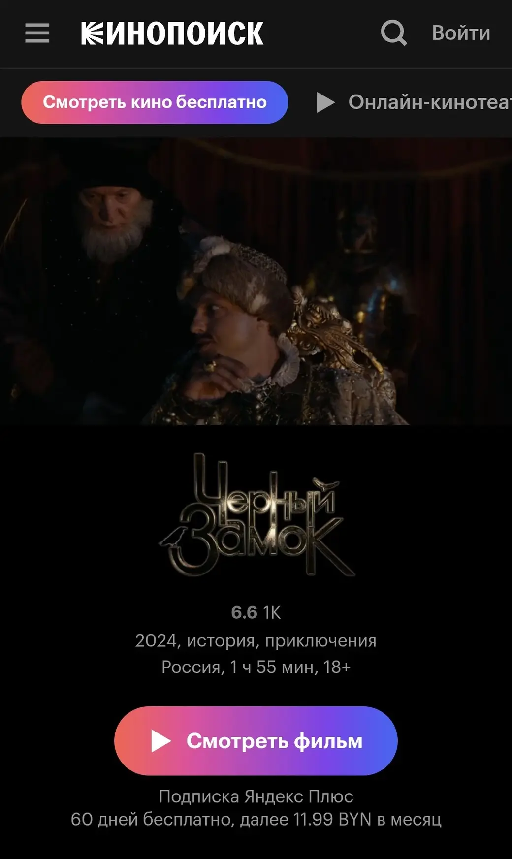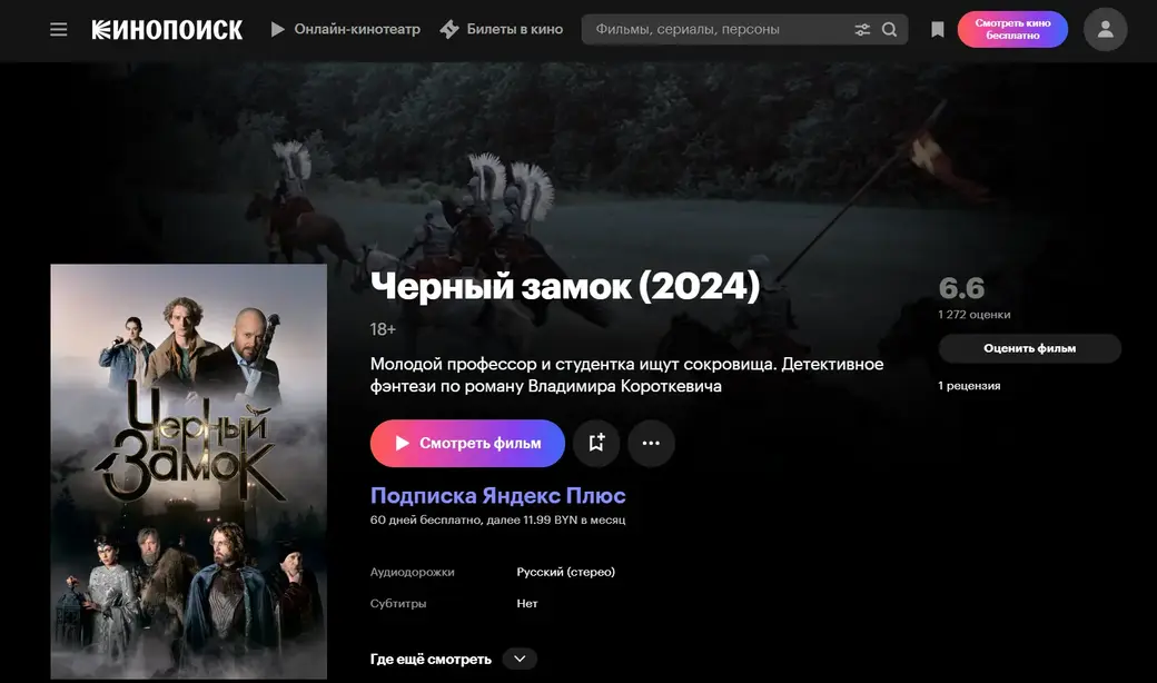 «Черный замок» можно посмотреть на Кинопоиске по подписке Яндекс Плюс. Помимо фильмов и сериалов, она дает доступ к трекам, подкастам и плейлистам в Яндекс Музыке, а еще электронным и аудиокнигам в Яндекс Книгах. Предусмотрен кешбэк баллами Плюса на поездки, заказы и покупки в сервисах Яндекса.