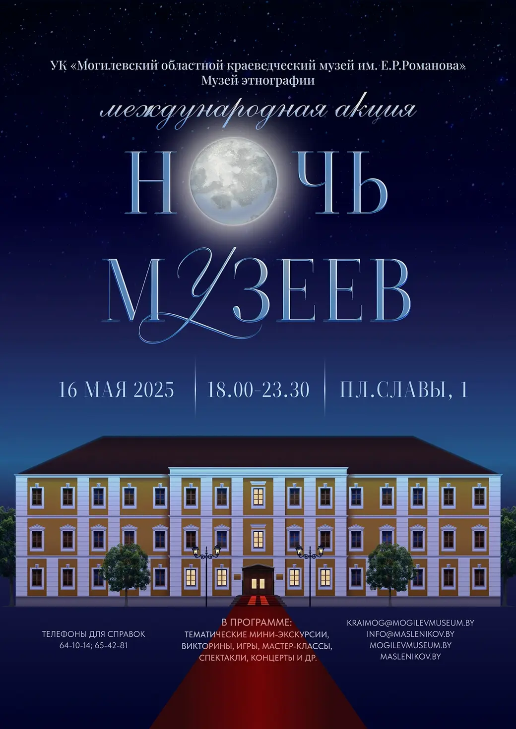 Могилевский краеведческий музей (пл. Славы, 1) традиционно подключается к акции «Ночь музеев». В программе – мини-выставки, интерактивные зоны, игровые программы, викторины, квесты, концерты, экскурсии. Время работы: с 18.00 до 23.30.