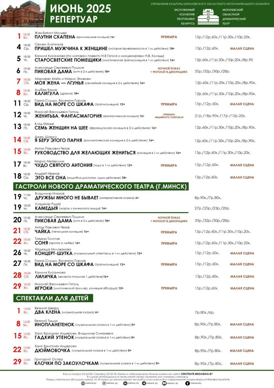 Июнь – время каникул и отпусков. Их поможет разнообразить Могилевский драмтеатр. В его афише ставшие популярными два ночных показа спектакля «Пиковая дама», гастроли Нового драматического театра из Минска, который покажет два спектакля: «Камедыя» и «Дружбы много не бывает». Также в афише все премьеры подходящего к завершению театрального сезона.