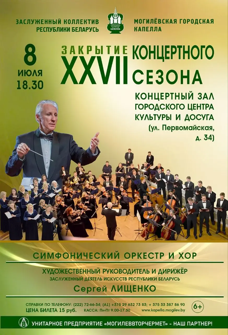 8 июля завершается очередной концертный сезон Могилевской городской капеллы. Подведет его черту большая концертная программа, в составе которой прозвучат популярная классическая, современная и эстрадная музыка, музыка из любимых кинофильмов, а также сольные партии.