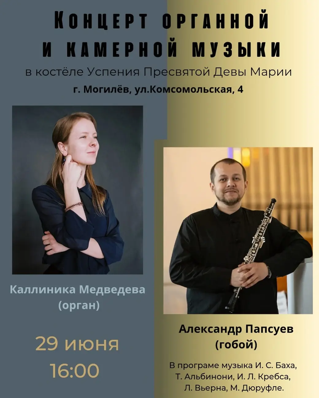 Концертная программа, которую исполнят Каллиника Медведева (орган) и Александр Папсуев (гобой), будет состоять из музыки, написанной классиками: Иоганном Себастьяном Бахом, Томазо Альбинони, Иоганном Людвигом Кребсом, Луи Вьерном, Морисом Дюруфле.