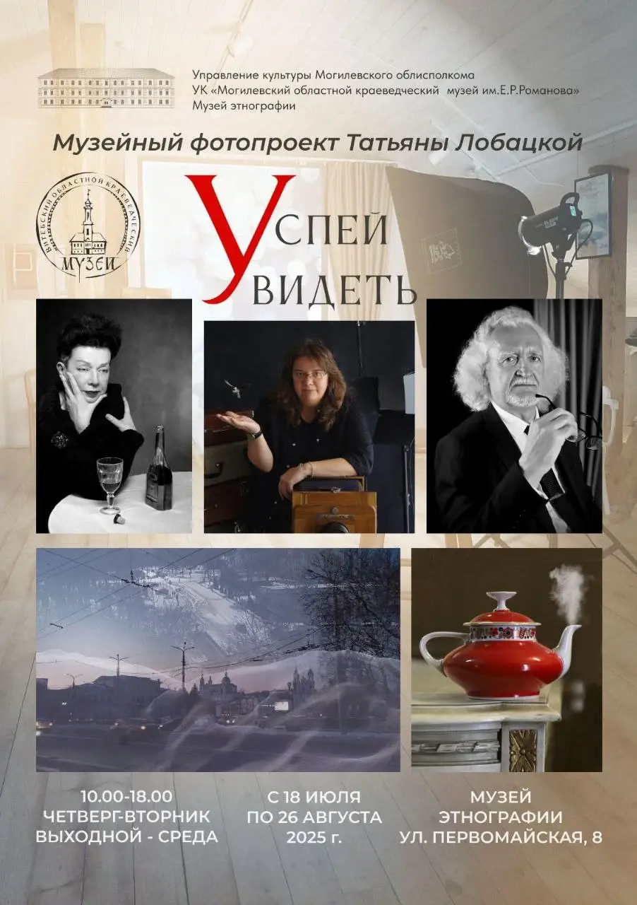 Выставочный проект «Успей увидеть» будет представлен в музее этнографии Могилева по 26 августа. Торжественная церемония открытия выставки состоится 18 июля в 17.00, в которой примет участие автор фотографий.