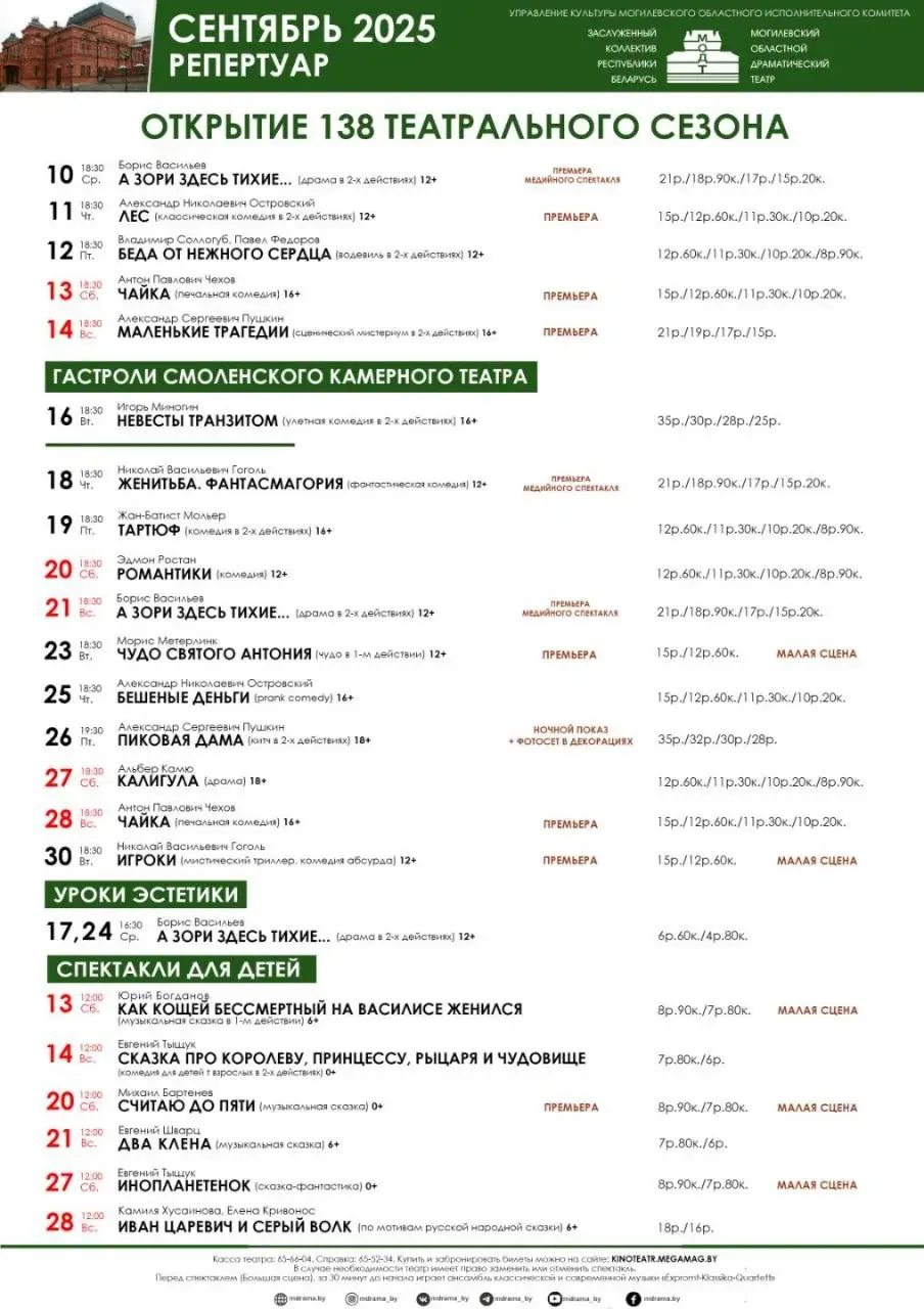 Ниже подробная афиша сентября. На протяжении месяца в ней возможны изменения. Справка по телефону: 80222-65-52-34.