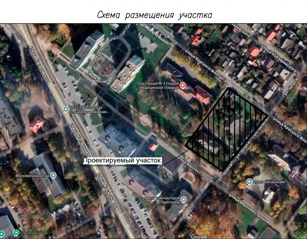 На северо-западе от проектируемого участка располагается подстанция N4 СМП, на северо-востоке – ул. Красного Флота и одноквартирные жилые дома. С юго-востока находится территория поликлиники. С юго-западной стороны располагается многоквартирная жилая застройка.